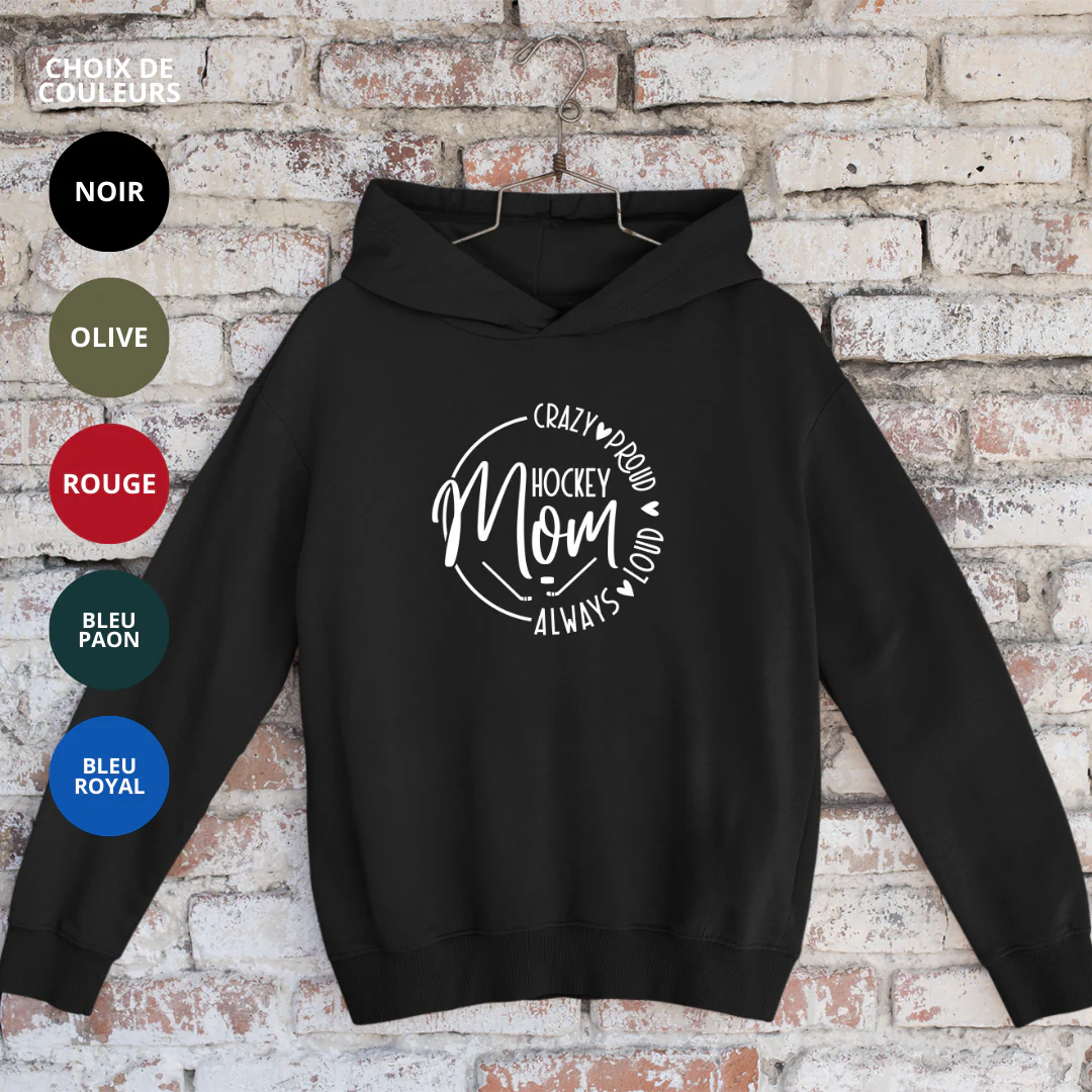 Hoodie unisexe en bambou fleece – couleurs variées – Hockey Mom – Crazy – Proud – Loud – Always