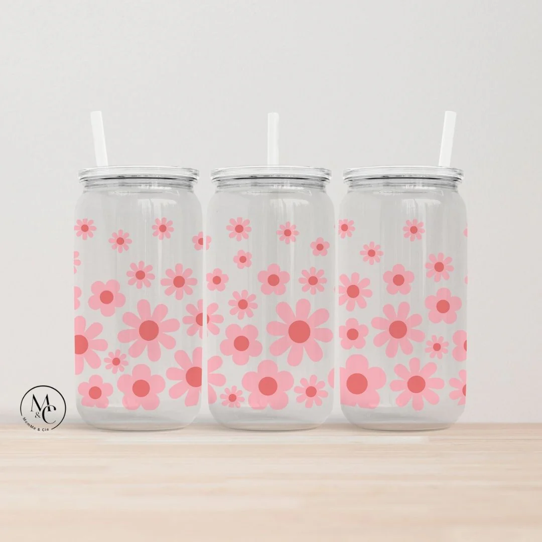 Verre en acrylique 16 oz avec couvercle et paille – couleurs variées – Fleurs roses