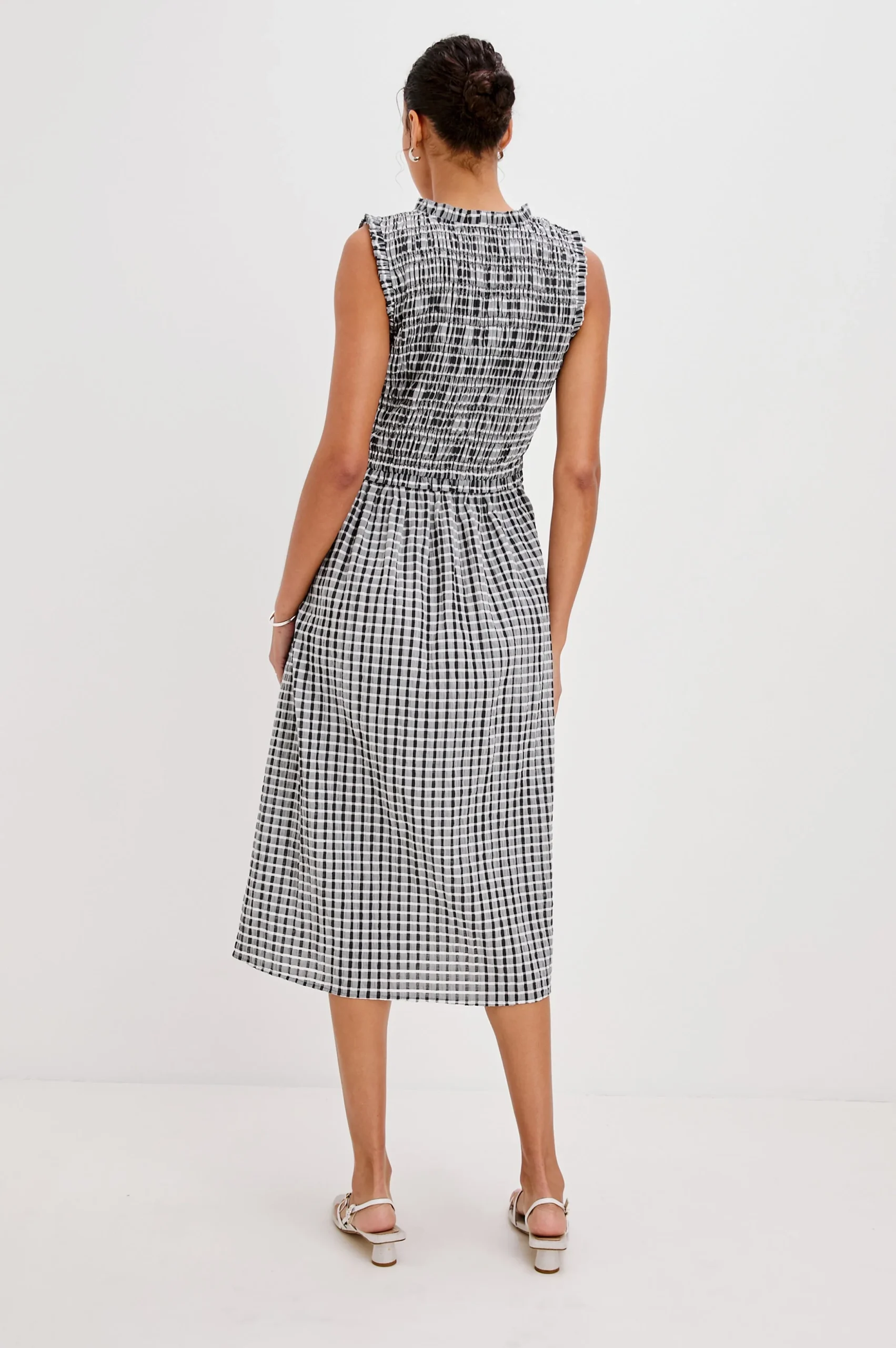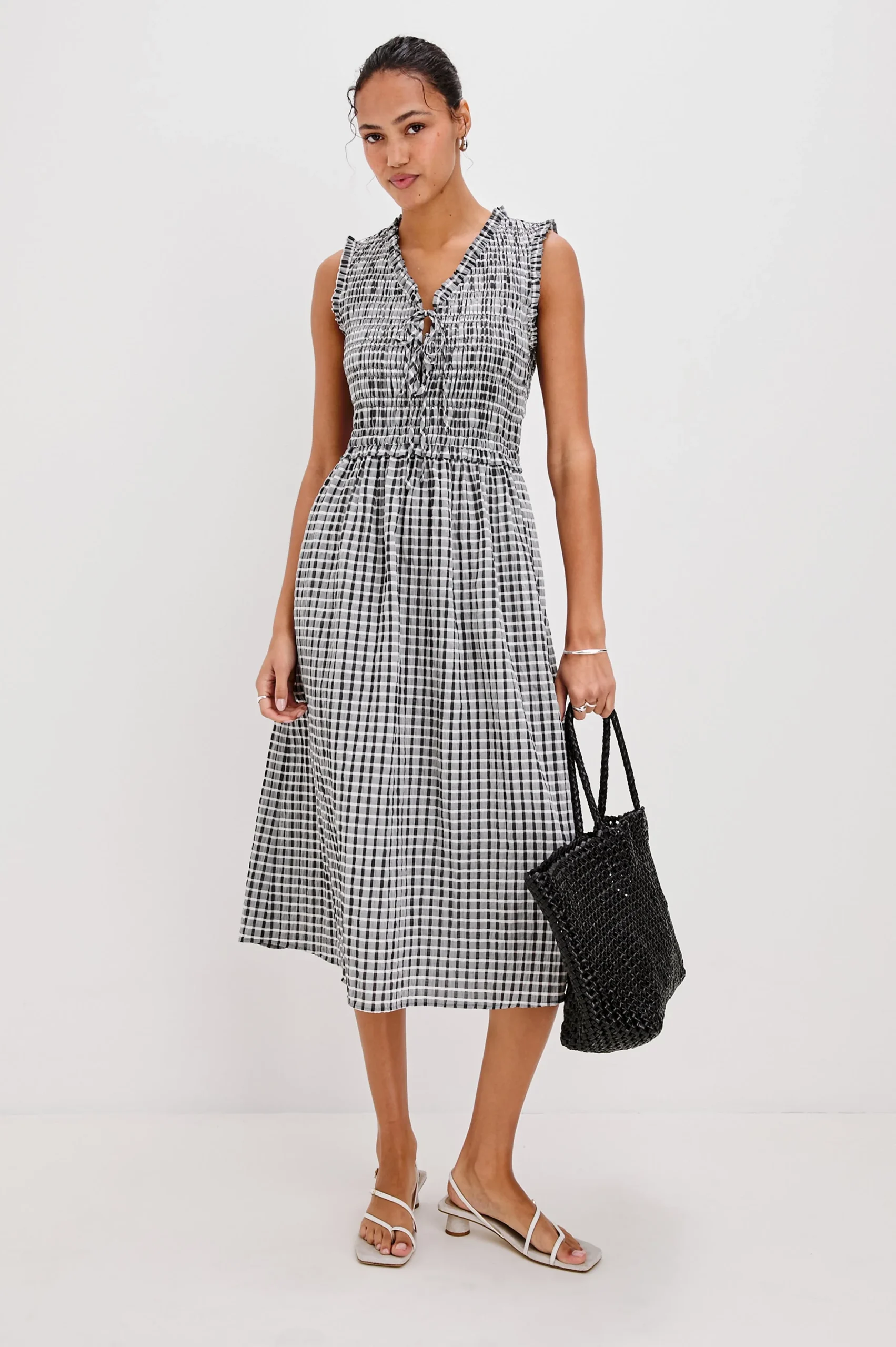 Crafted in a lightweight textured gingham fabric, the Adine midi dress features a fitted bodice, full skirt, and easy-wearing silhouette with feminine details.