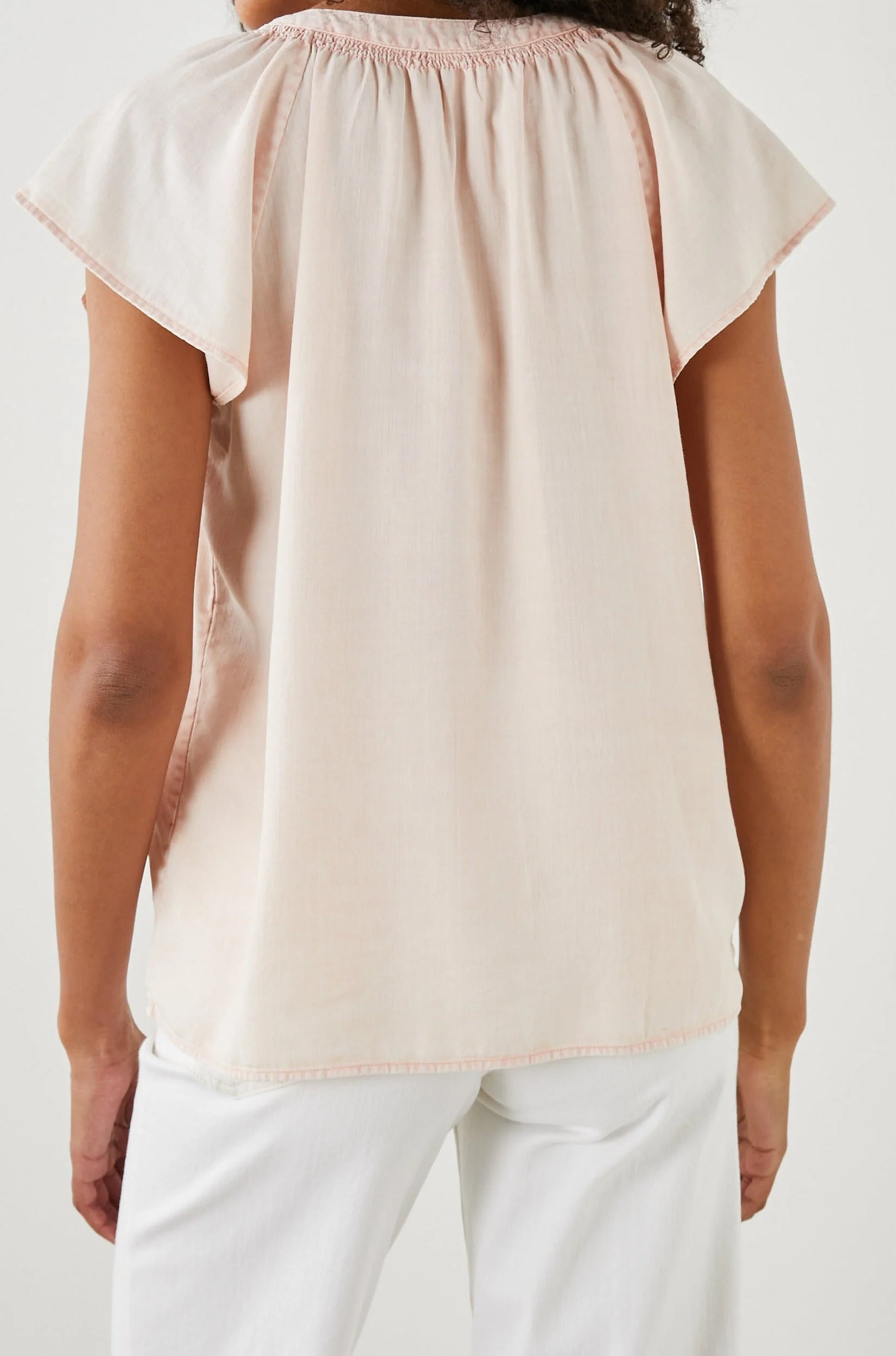 Lightweight, short sleeve, pink button down shirt featuring classic fit, v-neckline with smocking, and raglan flutter sleeves. This super soft, lightweight, Tencelâ„¢ shirt features subtle romantic details perfect for everyday wear.