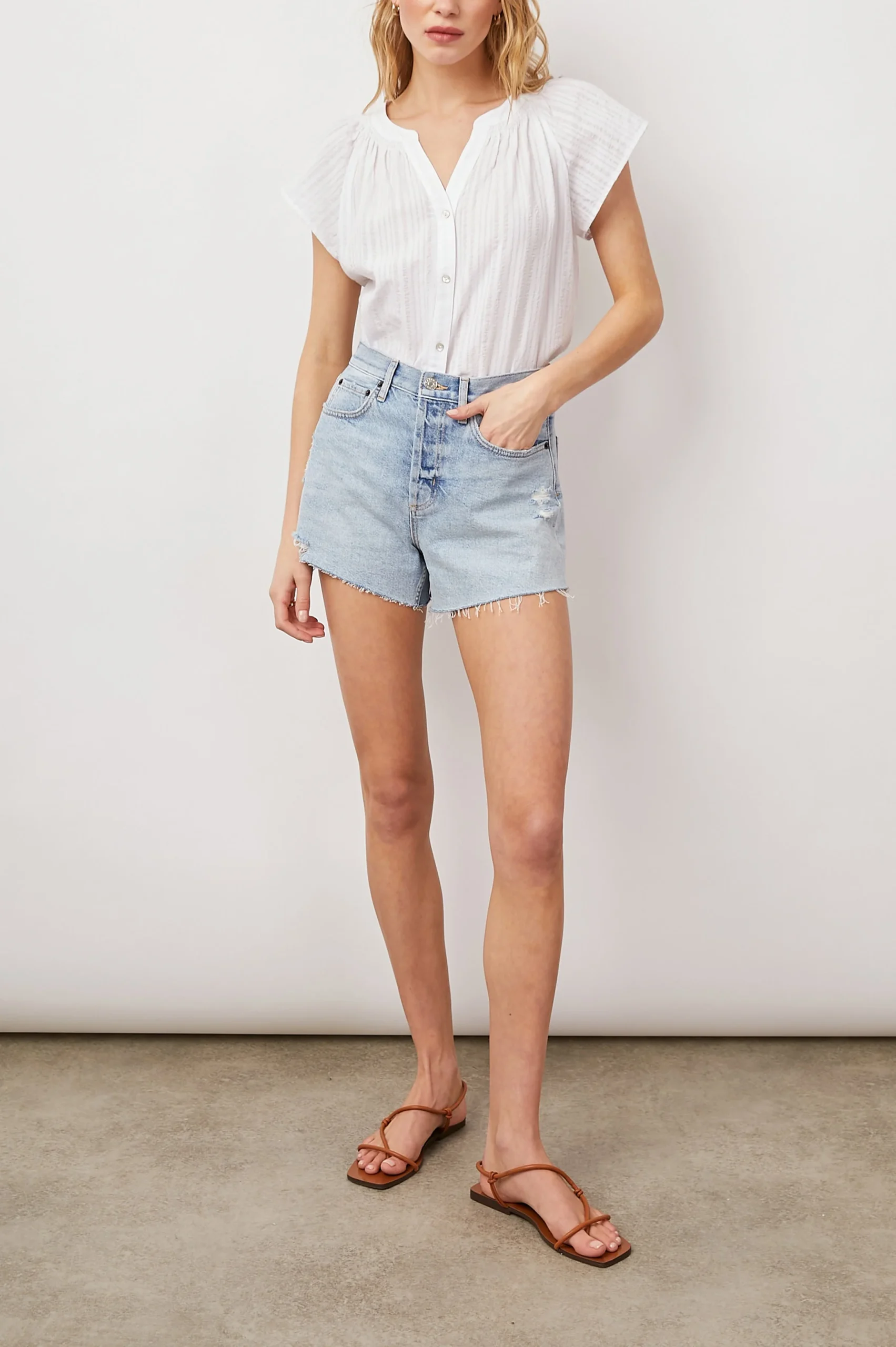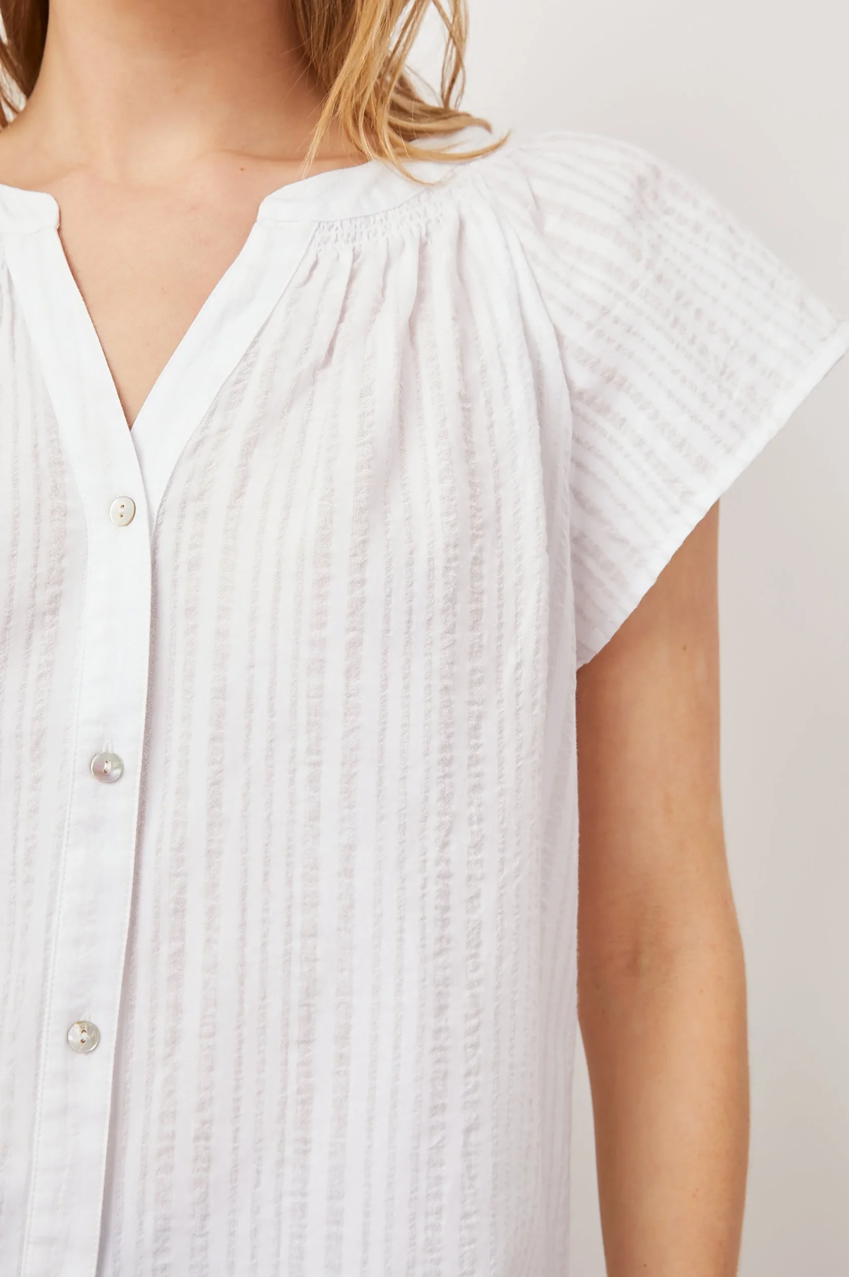 This super soft, lightweight shirt features subtle romantic details perfect for everyday wear. Made from organic cotton, this short sleeve button-down shirt features tonal shadow stripes, a classic fit, and raglan flutter sleeves.