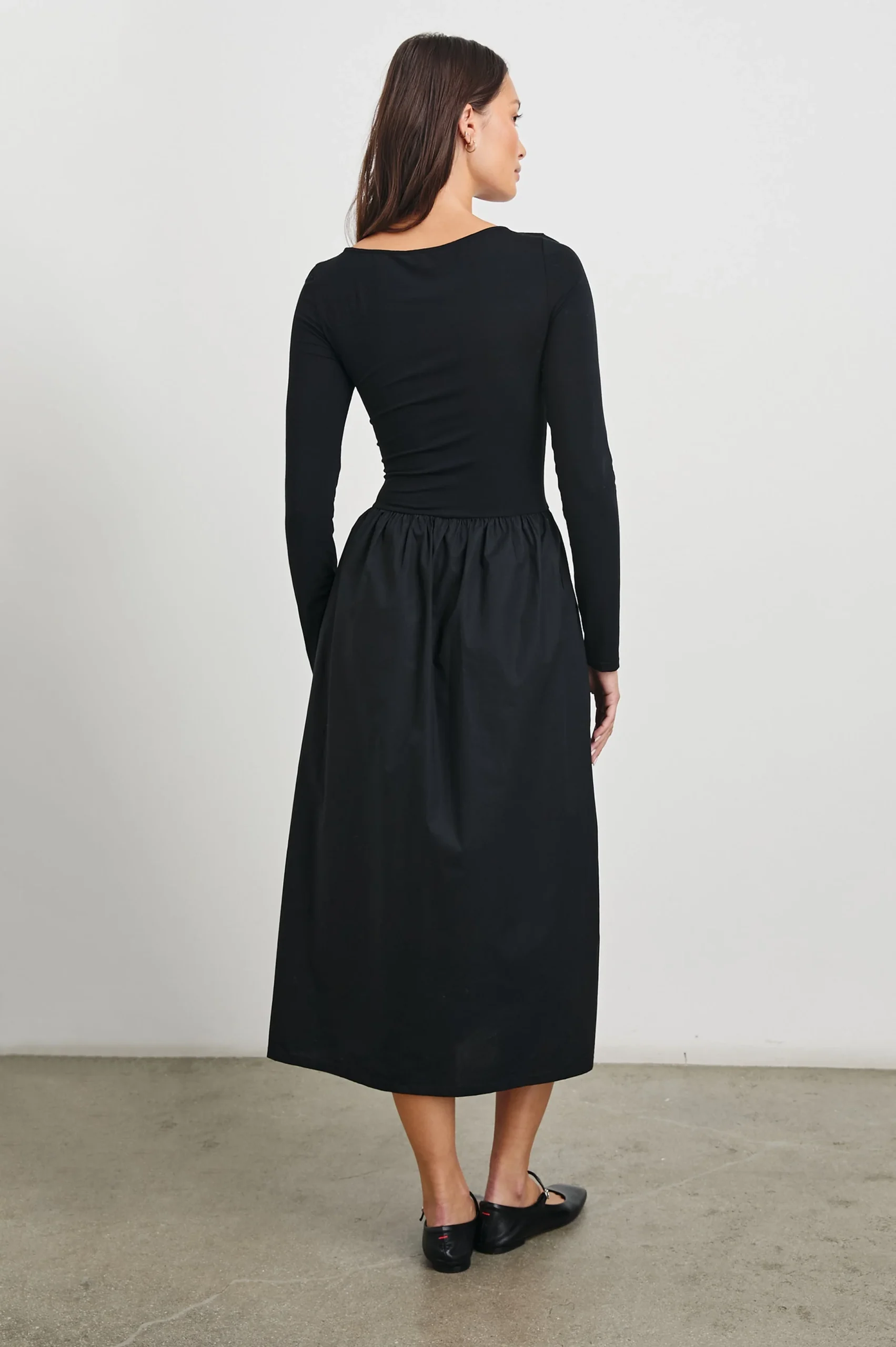 The Amberly is a long-sleeved reimagining of our best-selling Franca Dress, featuring the same jersey to poplin fabric transition and flattering dropped waist, with an updated boat neckline.