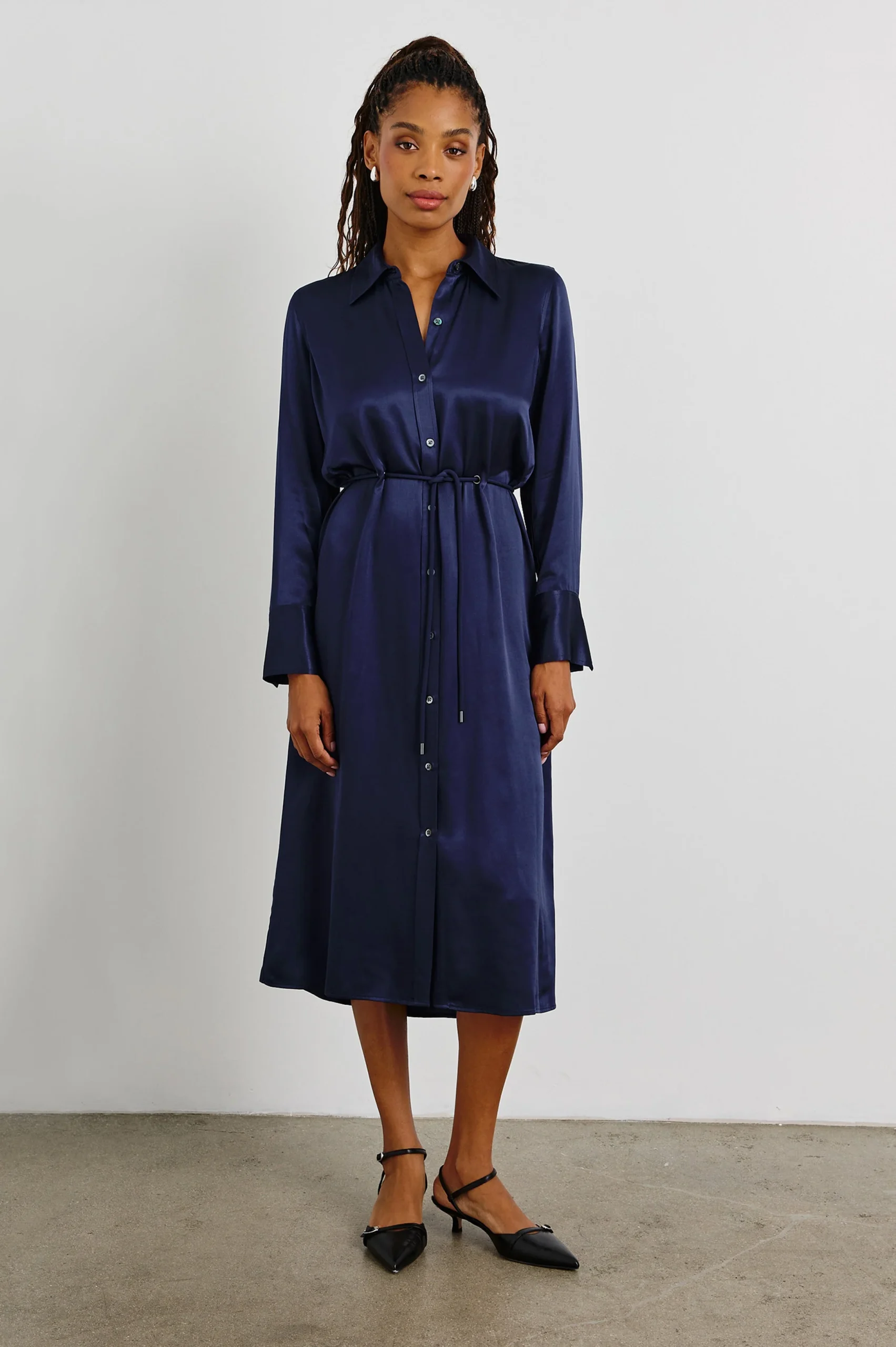 There’s nothing like a navy dress in the wintertime. The Anina is set to be a closet staple, made from luxe satin crepe and complete with a built-in belt, structured collar, and full-length buttons.