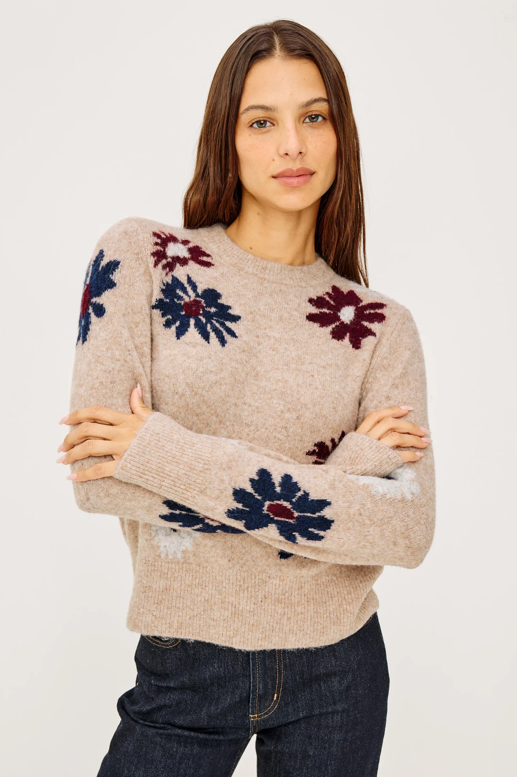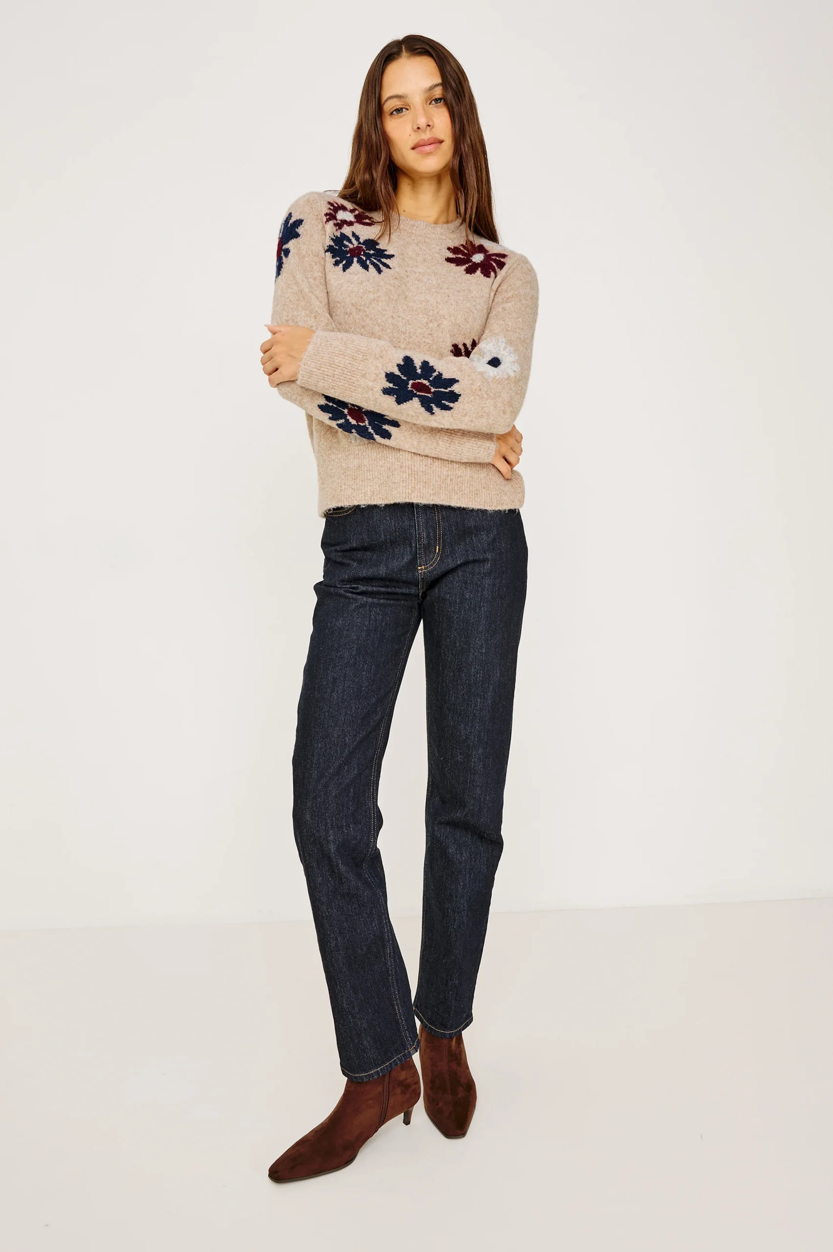 The Anise sweater exudes feminine charm with vintage-inspired contrast floral motifs. Knitted from a cozy wool blend, it features a classic crew neckline, long sleeves, and a relaxed, boxy fit.