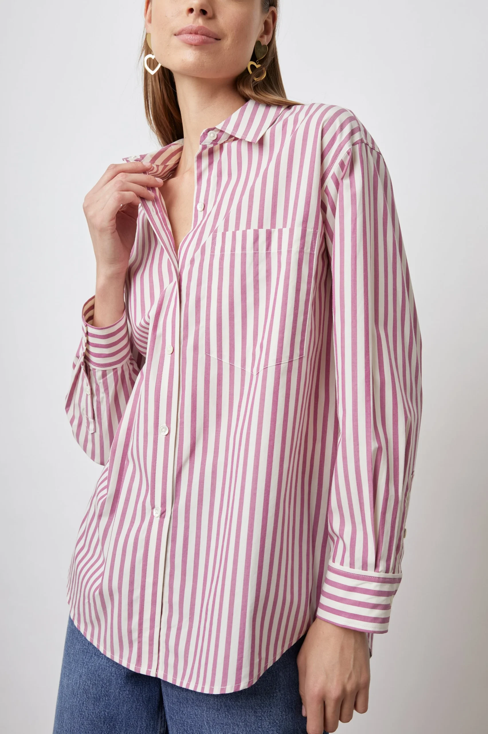 A piece from our Eco Collection, The Arlo Shirt is a crisp button-down shirt made from lightweight cotton poplin. While it’s inspired by classic menswear styling, pink stripes add a feminine twist. The oversized fit is comfortable for day-to-night wear and pairs nicely with denim and your favorite boots.