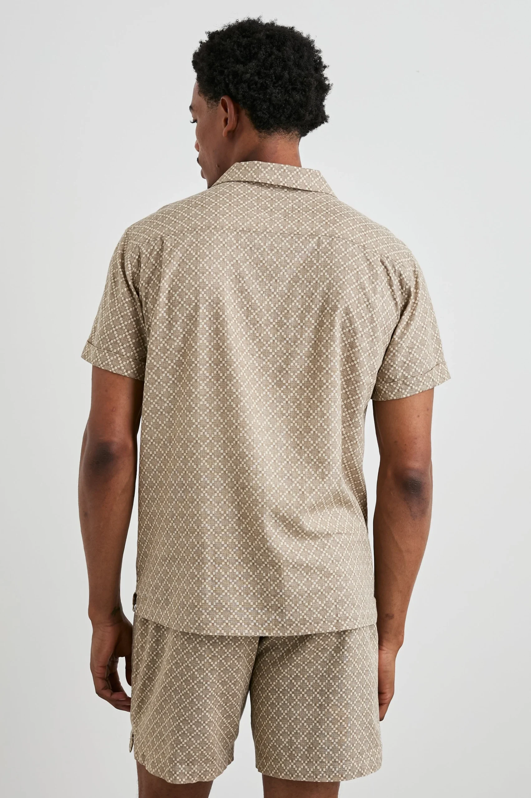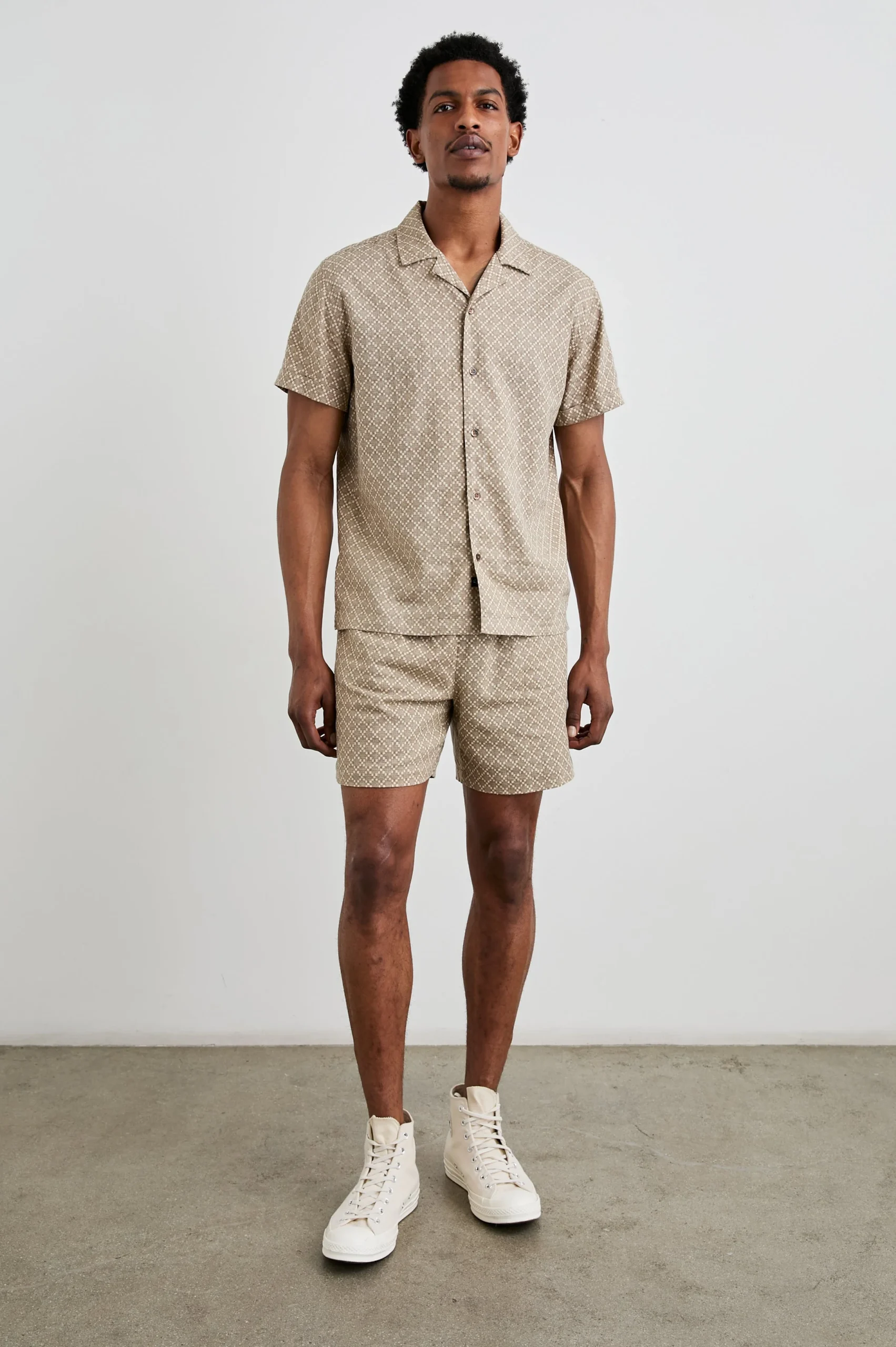 With an intricate Art Deco-inspired print, the Atlas is a stretch linen blend shirt that is sure to be your favorite short sleeve button-down. Make it a set with the Aries short.