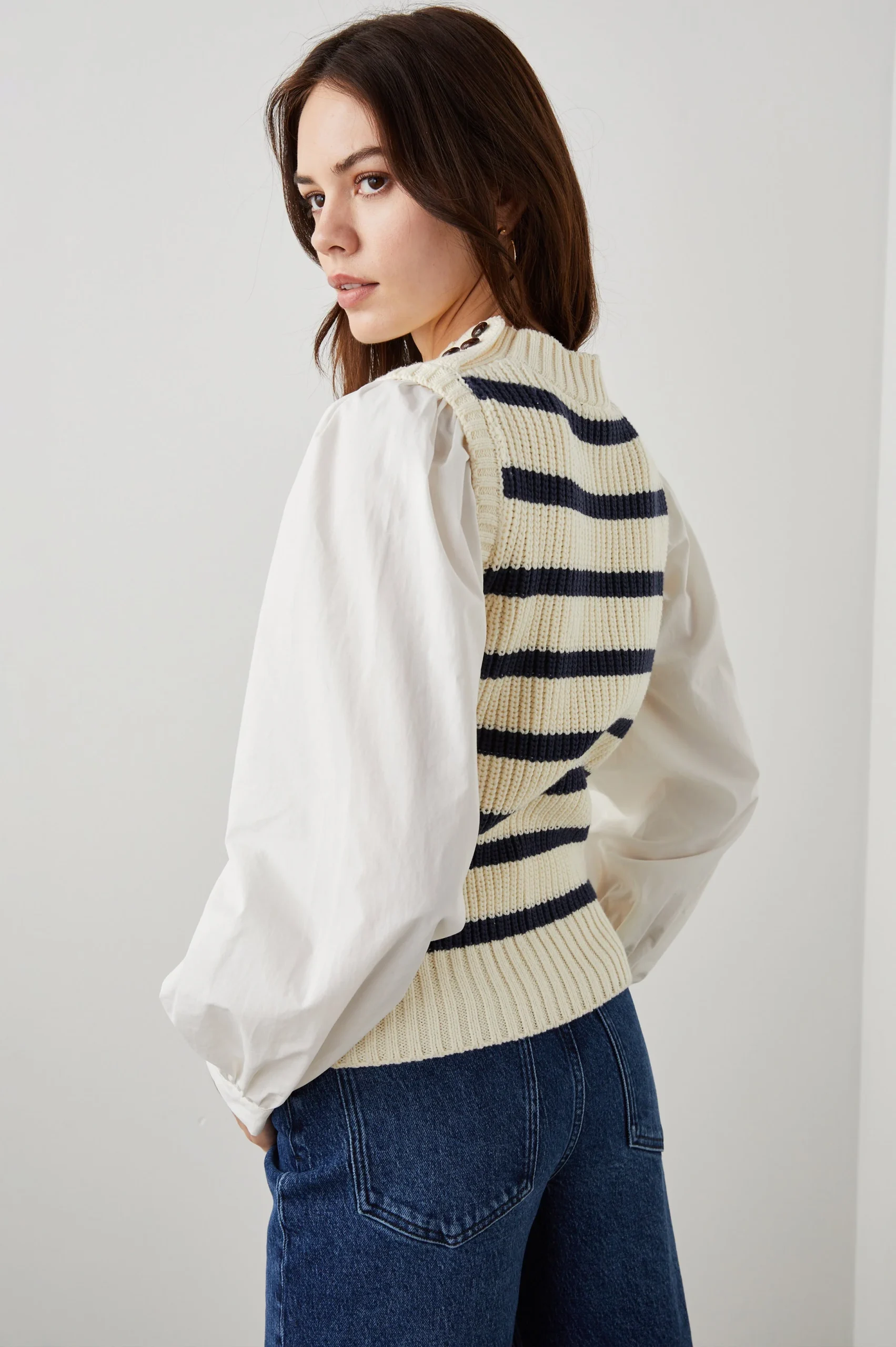 The two-in-one look your closet needs. The Bambi does the layering for you, with a cotton blend sweater vest attached to a cotton poplin undershirt. This style pairs well with denim, slacks, skirts, and so much more.