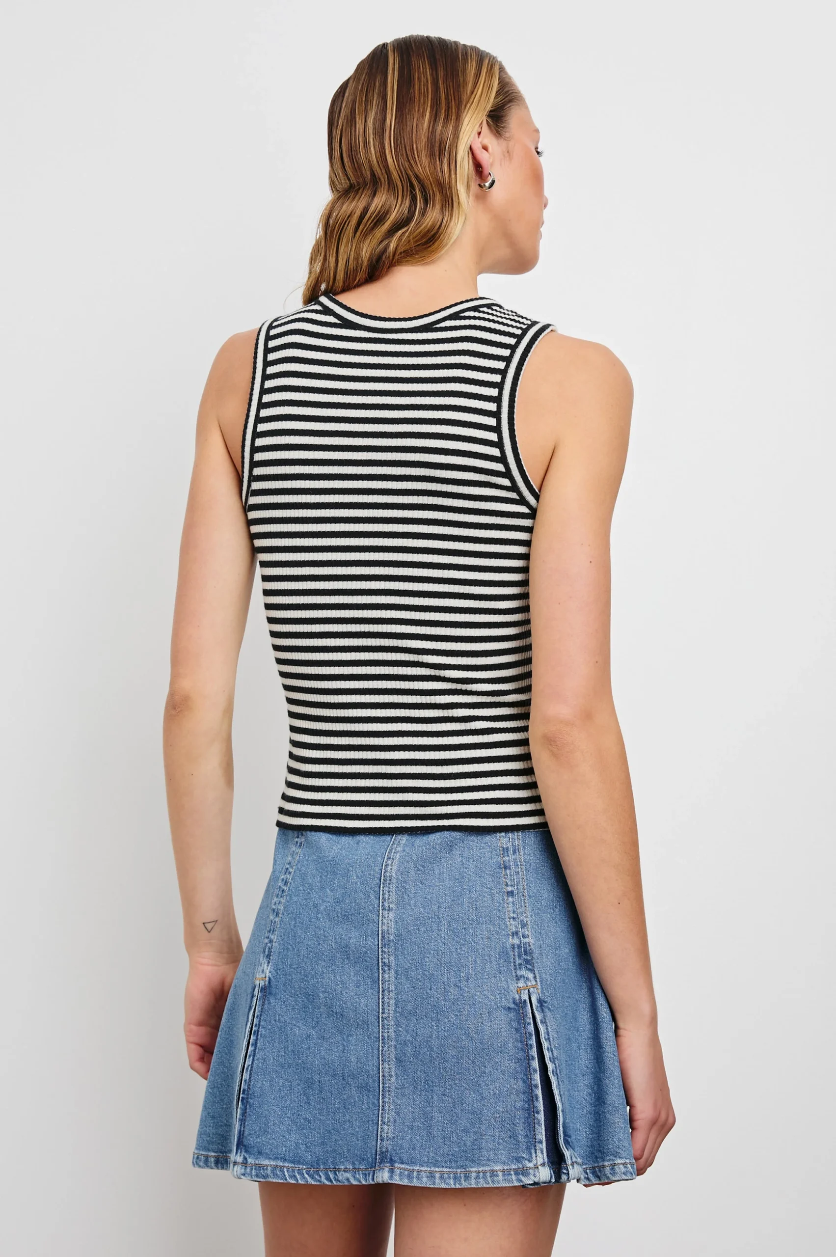 A sporty, high-rise mini, the Broad is a skort-inspired fitted skirt with a flared silhouette, dual box pleats, and an adjustable belt to cinch at the waist.