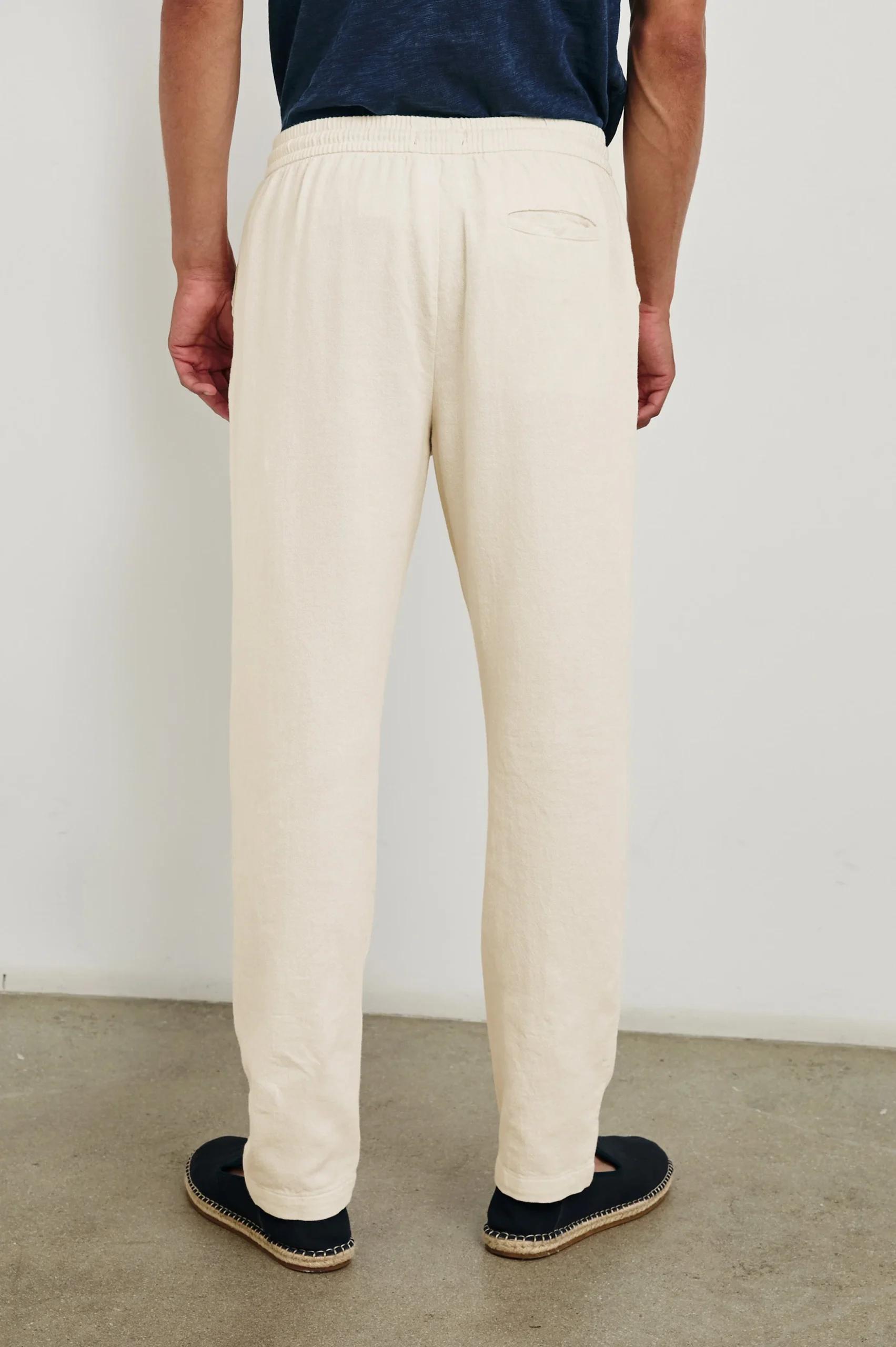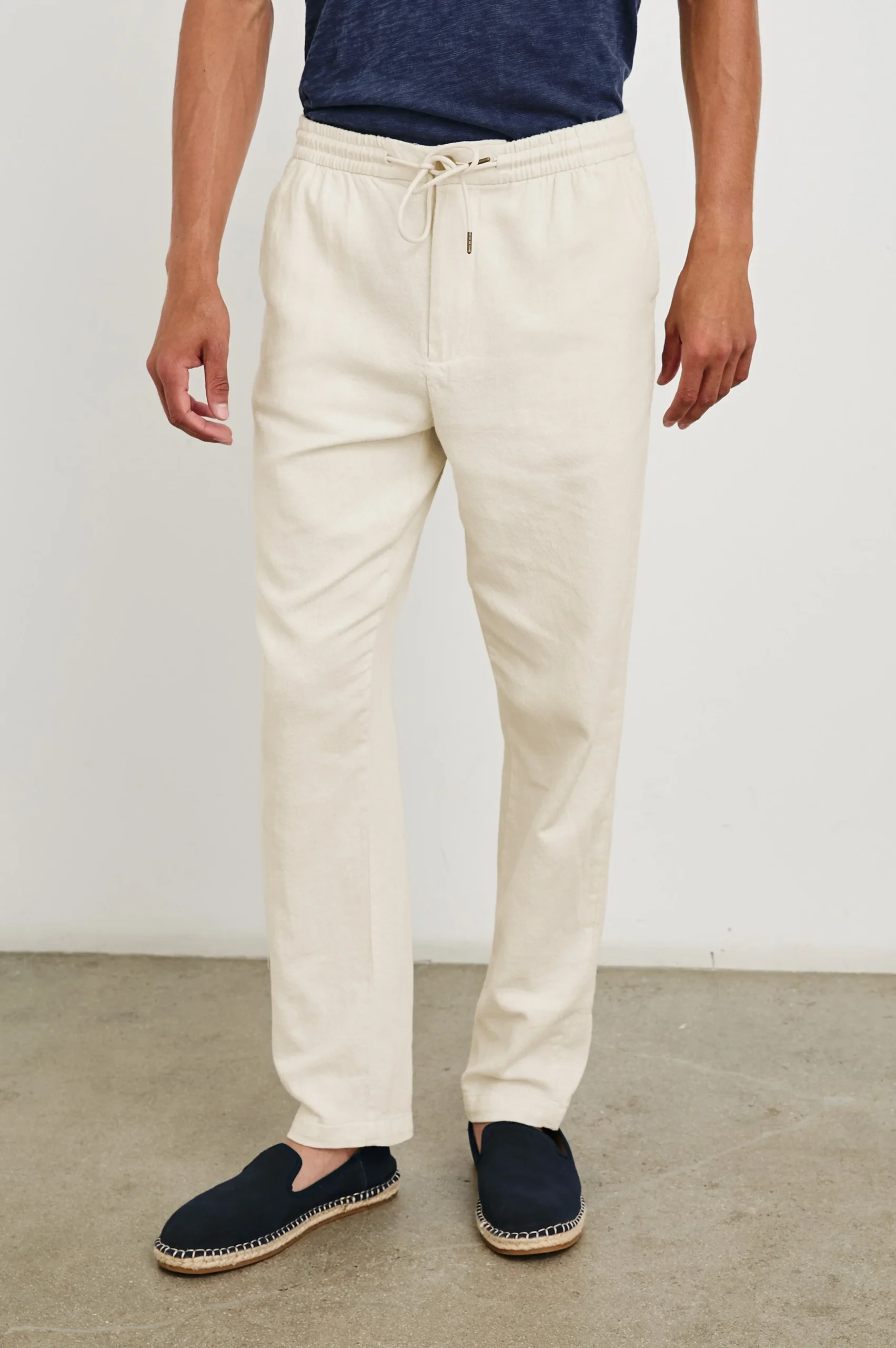 The Callum transforms the lounge pant into the ultimate comfortable slacks. Crafted from breathable cotton-linen twill, it features a slightly tapered, straight-leg fit, an elastic waistband, and an adjustable drawstring for a customizable fit.