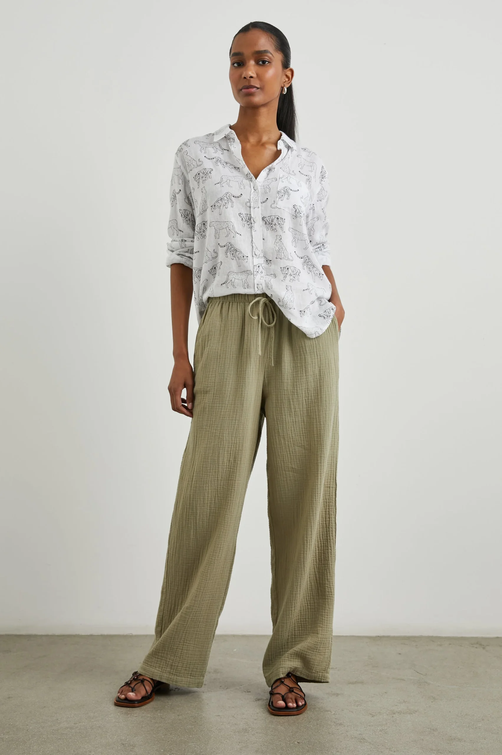The Charli Shirt is a breezy take on the classic button-down. Made of a lightweight linen blend, white serves as the background of a jungle cat pattern. It’s designed and tailored for refinement, but can serve both laid back and office casual styles.