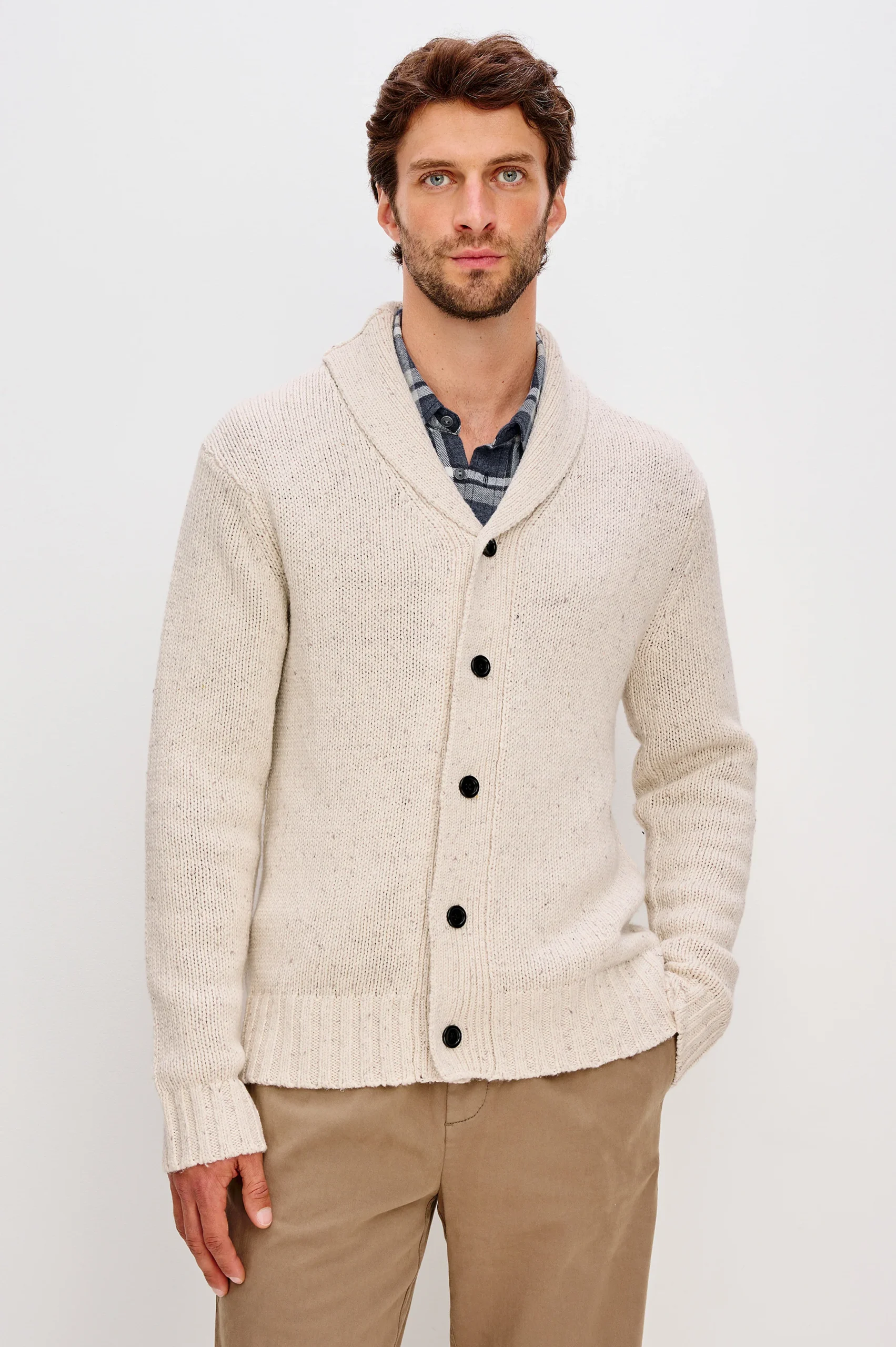 Classic comfort, elevated. The Corden shawl collar sweater features a button-front design in soft speckled cotton-blend knit, finished with ribbed trim and a relaxed drop-shoulder silhouette for timeless, heritage-inspired style.