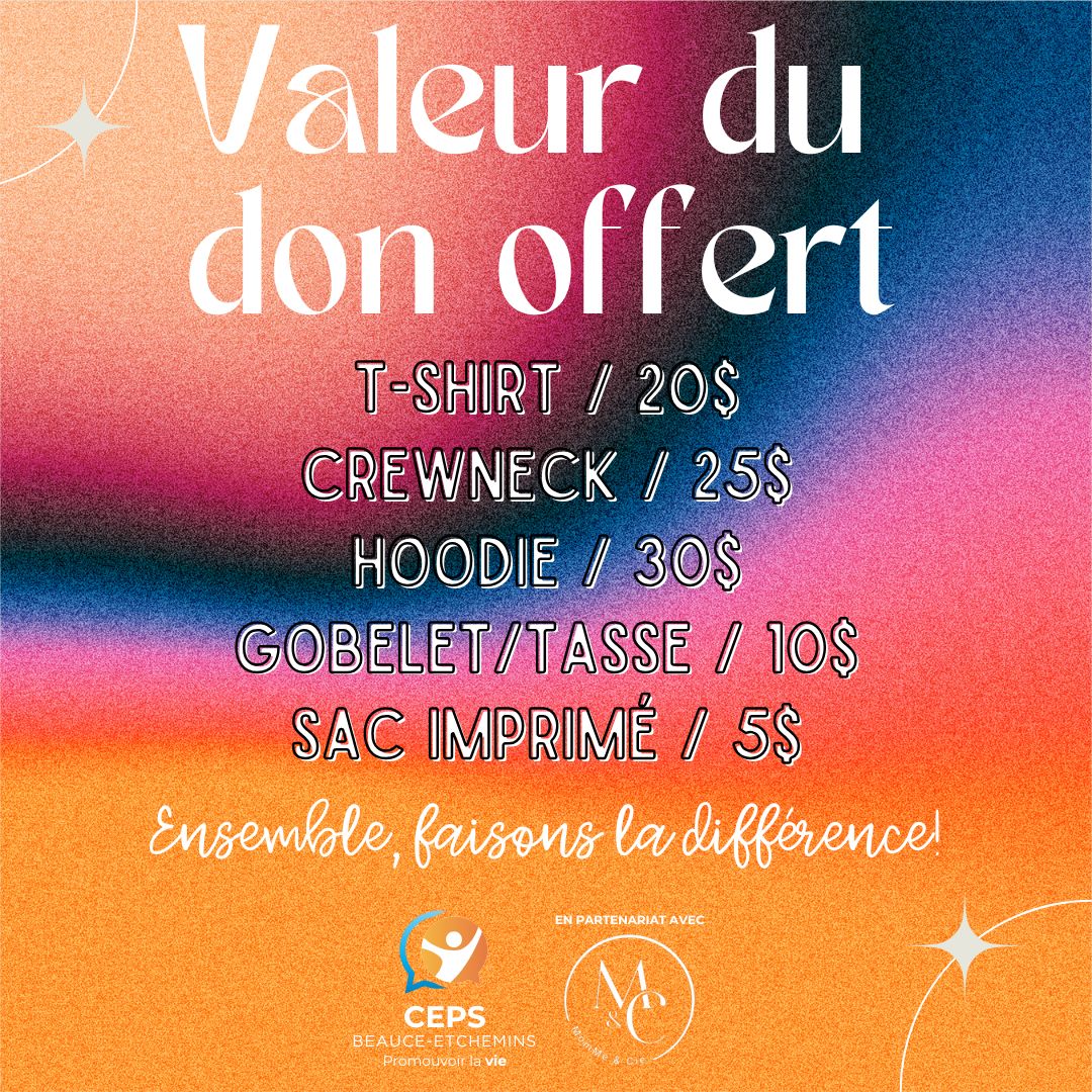 Nous sommes fiers d’annoncer notre partenariat avec le Centre d’Écoute et de Prévention du Suicide Beauce-Etchemins (CEPS). Dans le cadre de cette collaboration, une mini-collection exclusive a été créée pour soutenir leur mission essentielle: offrir un soutien et des ressources pour prévenir le suicide dans notre communauté. Une partie des profits de chaque vente sera reversée à la Fondation Un Geste pour la Vie, permettant de contribuer à cette cause vitale. Ensemble, créons un impact positif et faisons une différence, un geste à la fois.