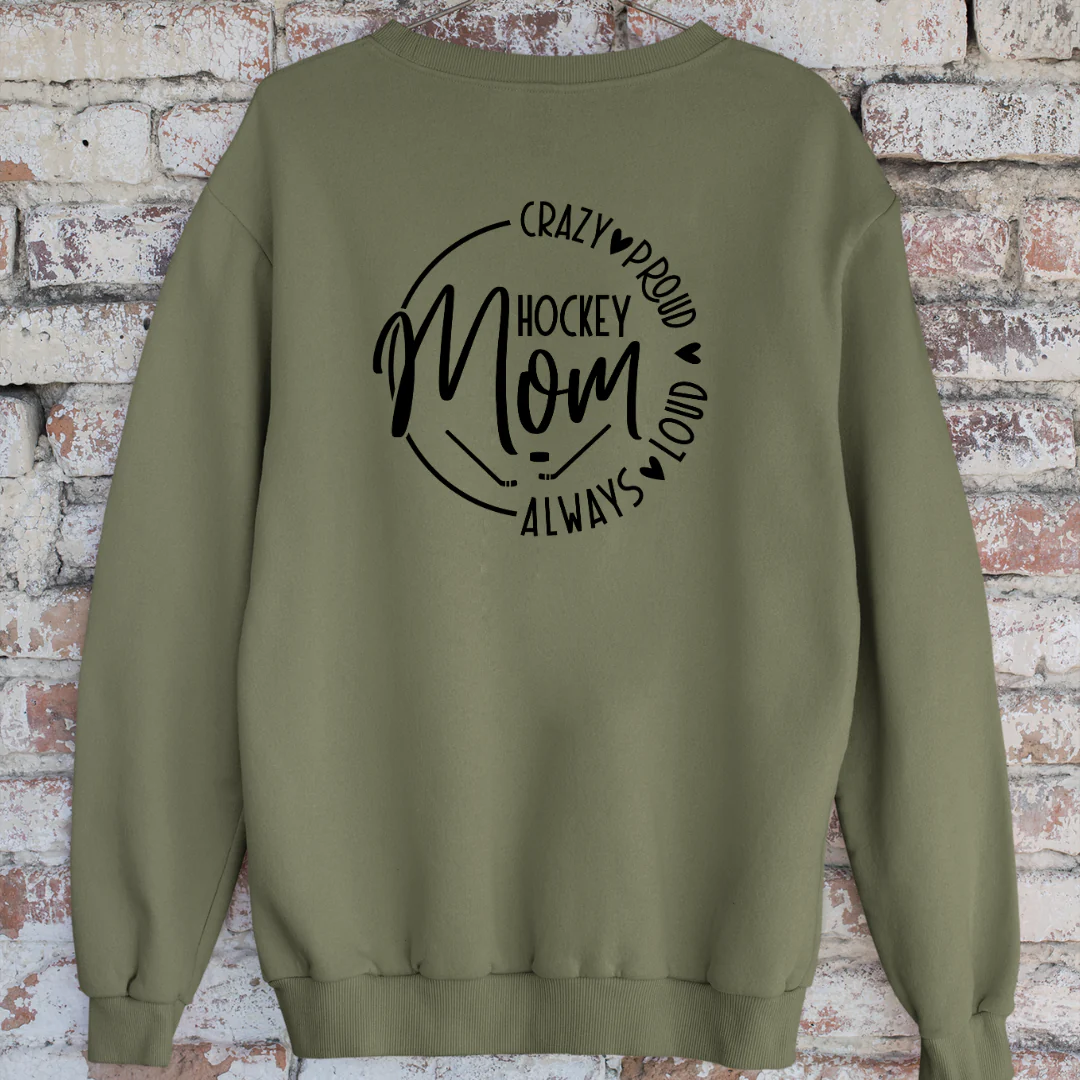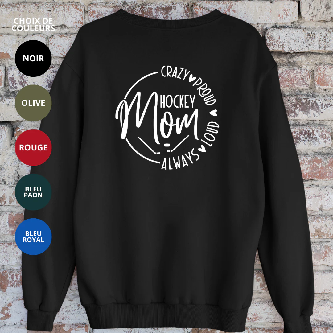 Crewneck en bambou fleece – couleurs variées – Impression Hockey Mom Crazy – Proud – Loud – Always