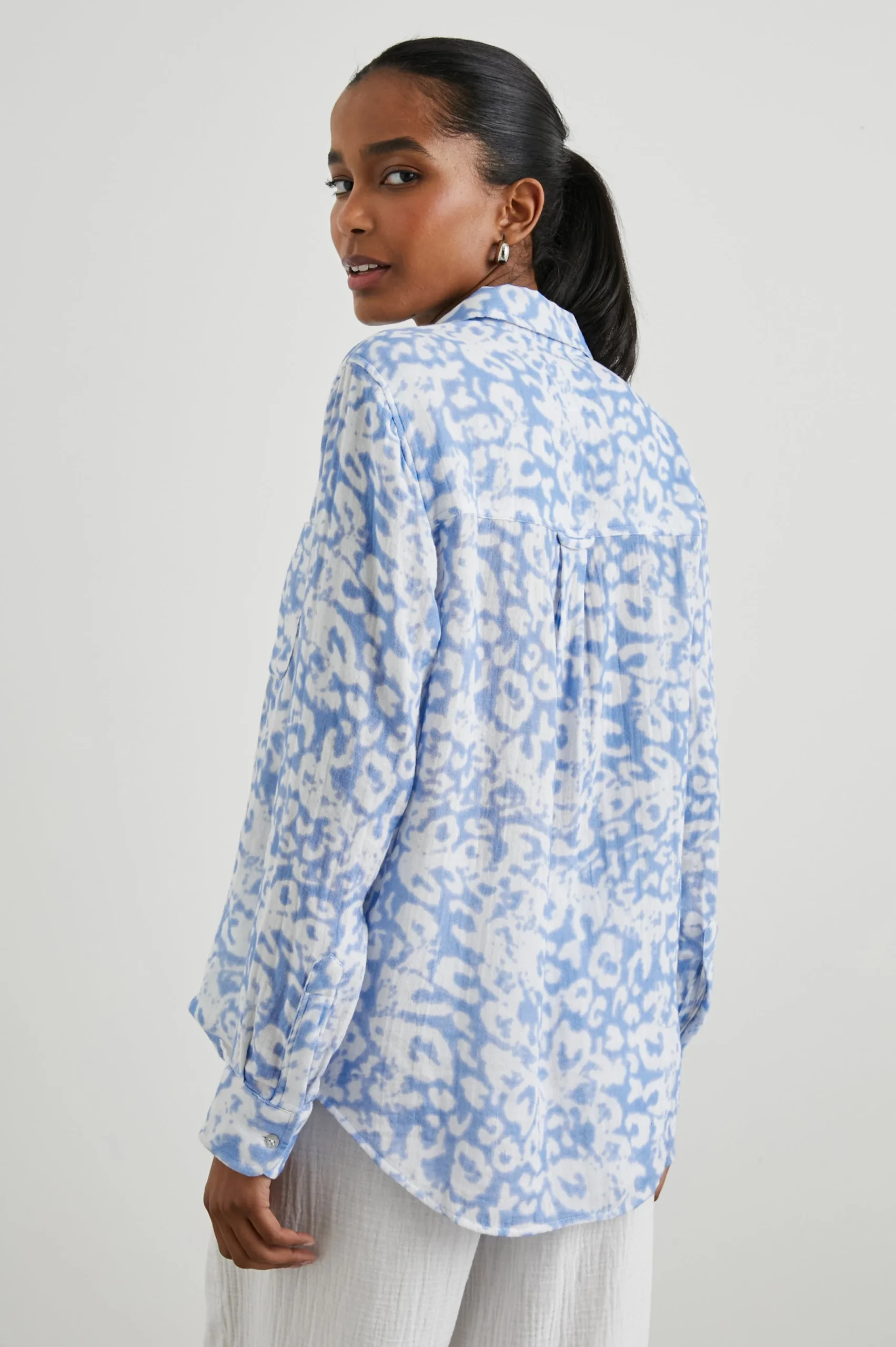 Lightweight, breezy, and breathable, this chic classic is a must-have for everyday elevated comfort. Made from organic cotton gauze, this blue animal printed button-down shirt features a single patch pocket at chest, natural shell buttons and a classic fit.