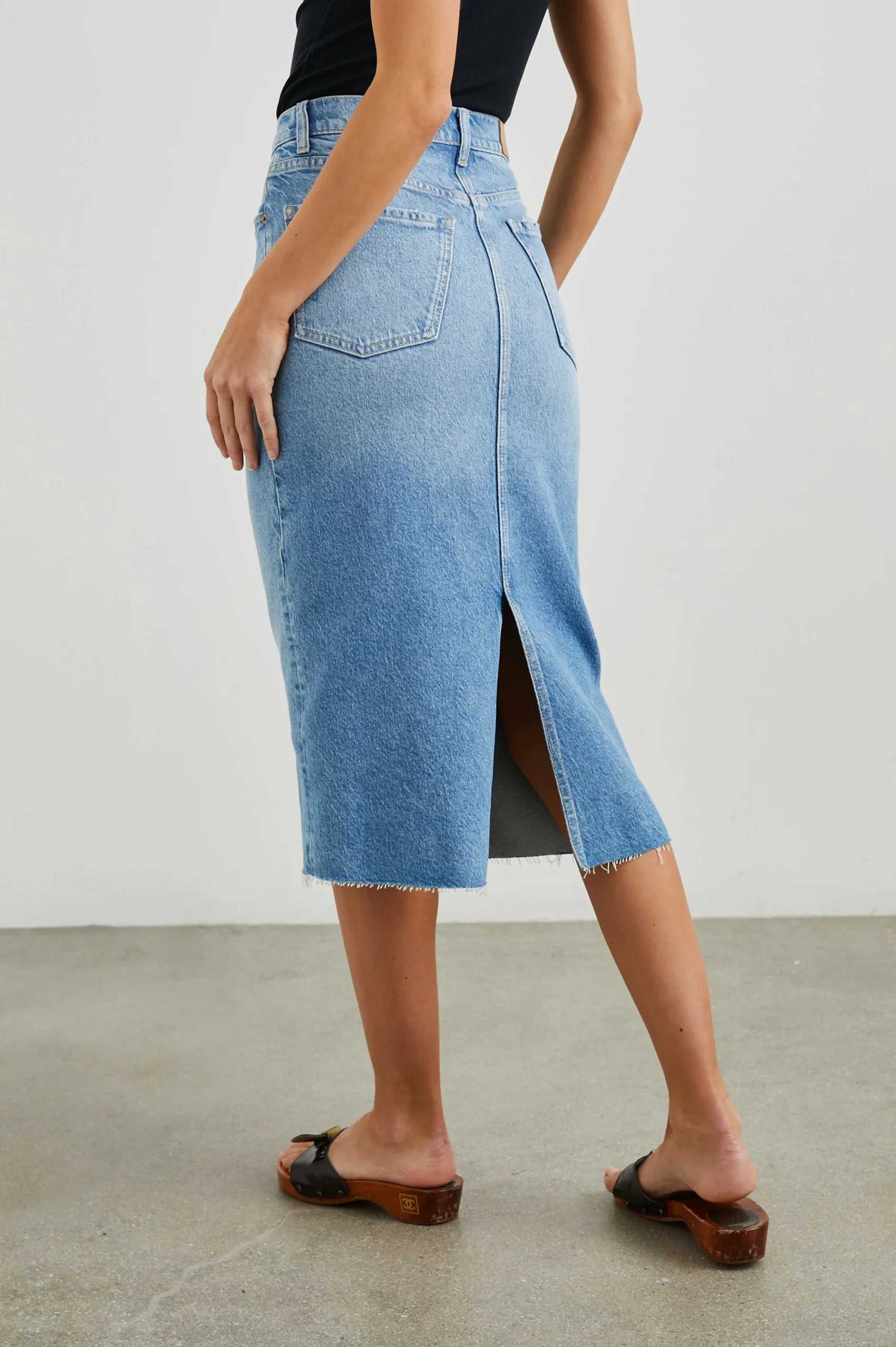 Move over mini skirt. The Highland is a high waisted midi skirt with a zipper fly and a back vent. Baja Blue is a bright blue wash with a raw hem, reminding you of tropical waters.