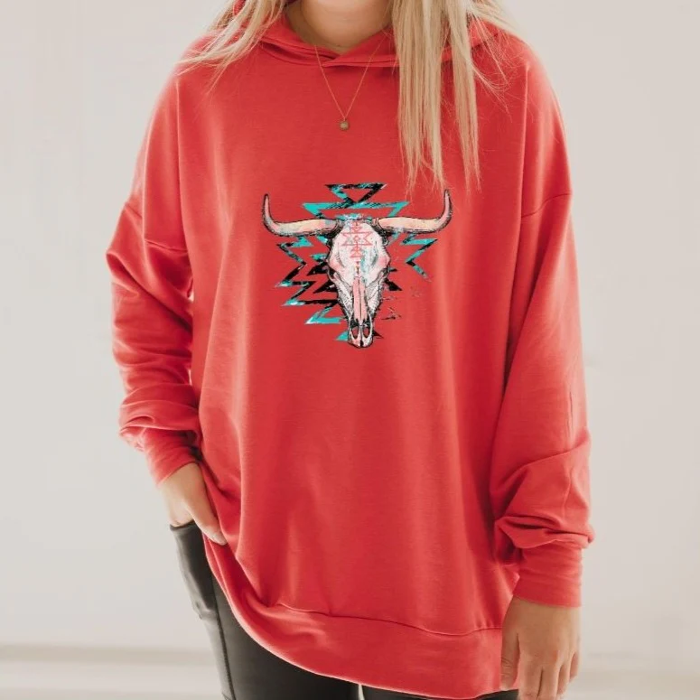 Hoodie oversize manche longue en bambou corail avec bande à la taille pour femme – CRÂNE GÉOMÉTRIQUE