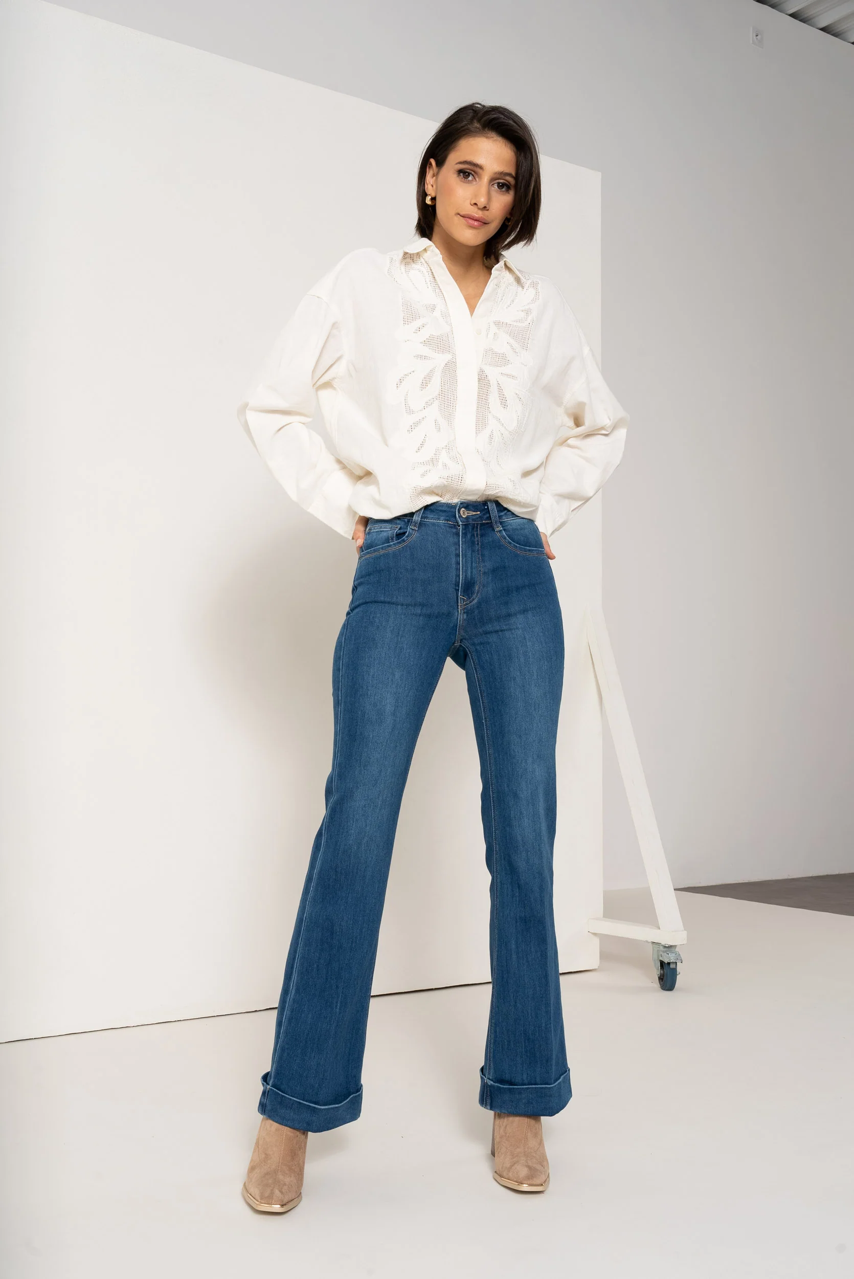 Les revers aux bas de jambes sont comme un clin d’œil à l’essence même des années 70, ajoutant une touche de rétro-chic à votre look. Et pour accentuer encore cet effet, rien de tel que de porter ce jean avec des talons compensés, pour une allure à la fois glamour et décontractée.