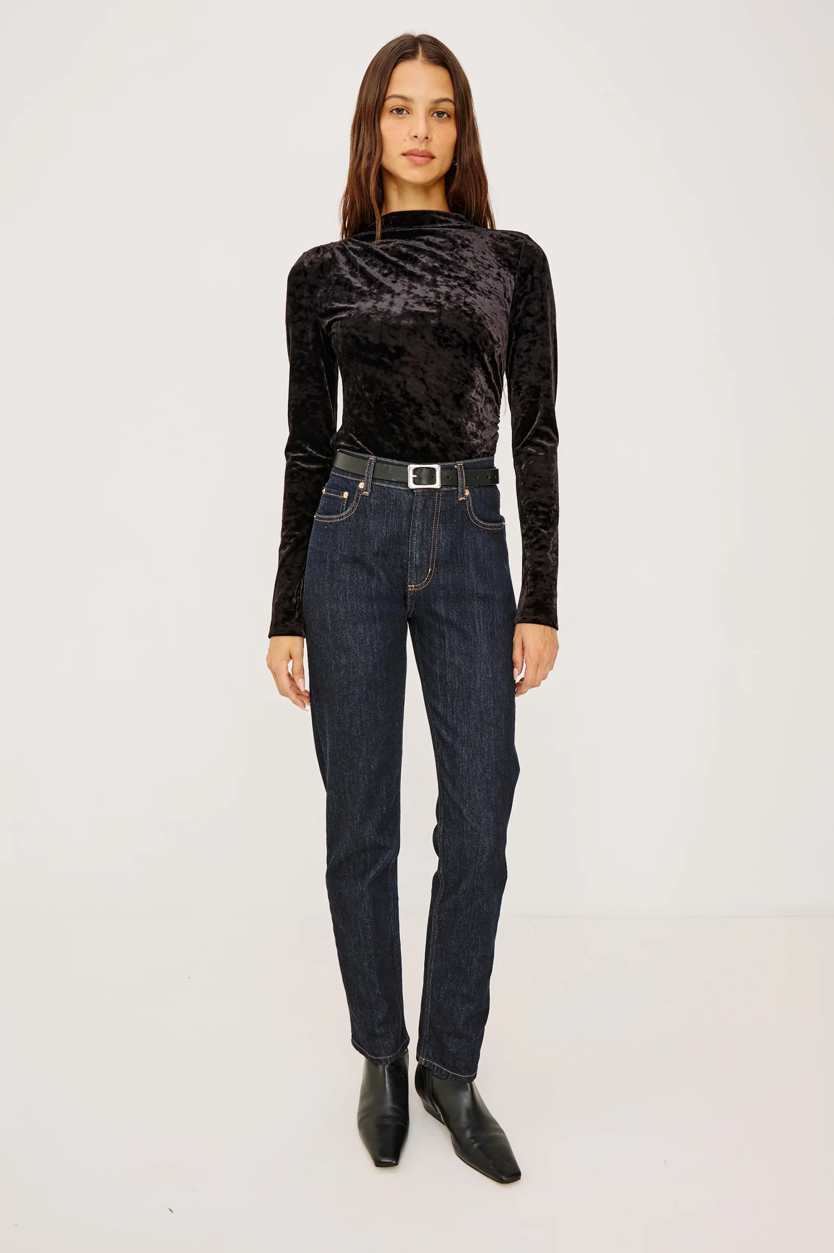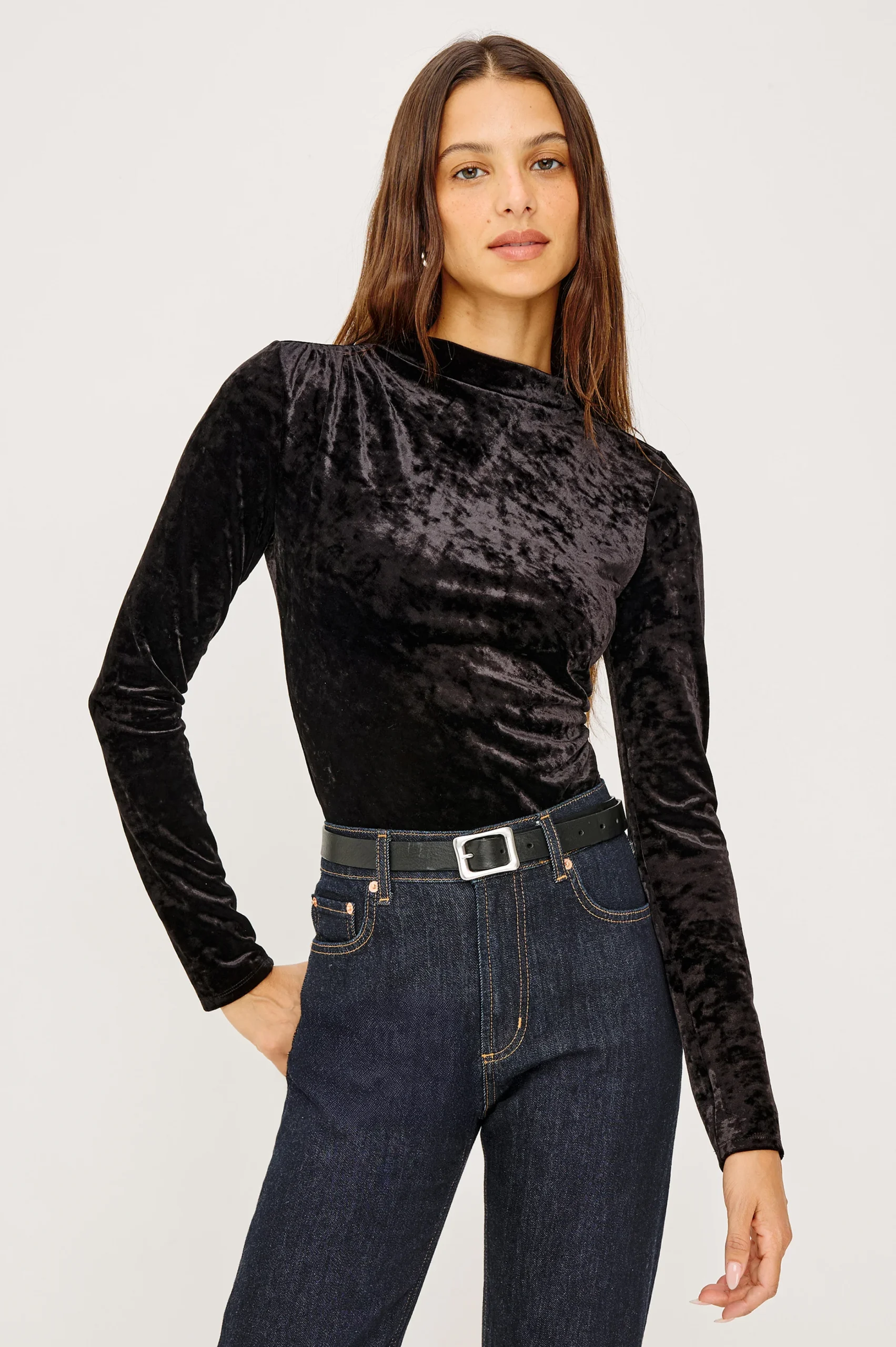 A modern take on the classic long sleeve, the Joelle top is crafted from a soft gauge jersey with an asymmetrical mock neck with shirring details from the right shoulder.