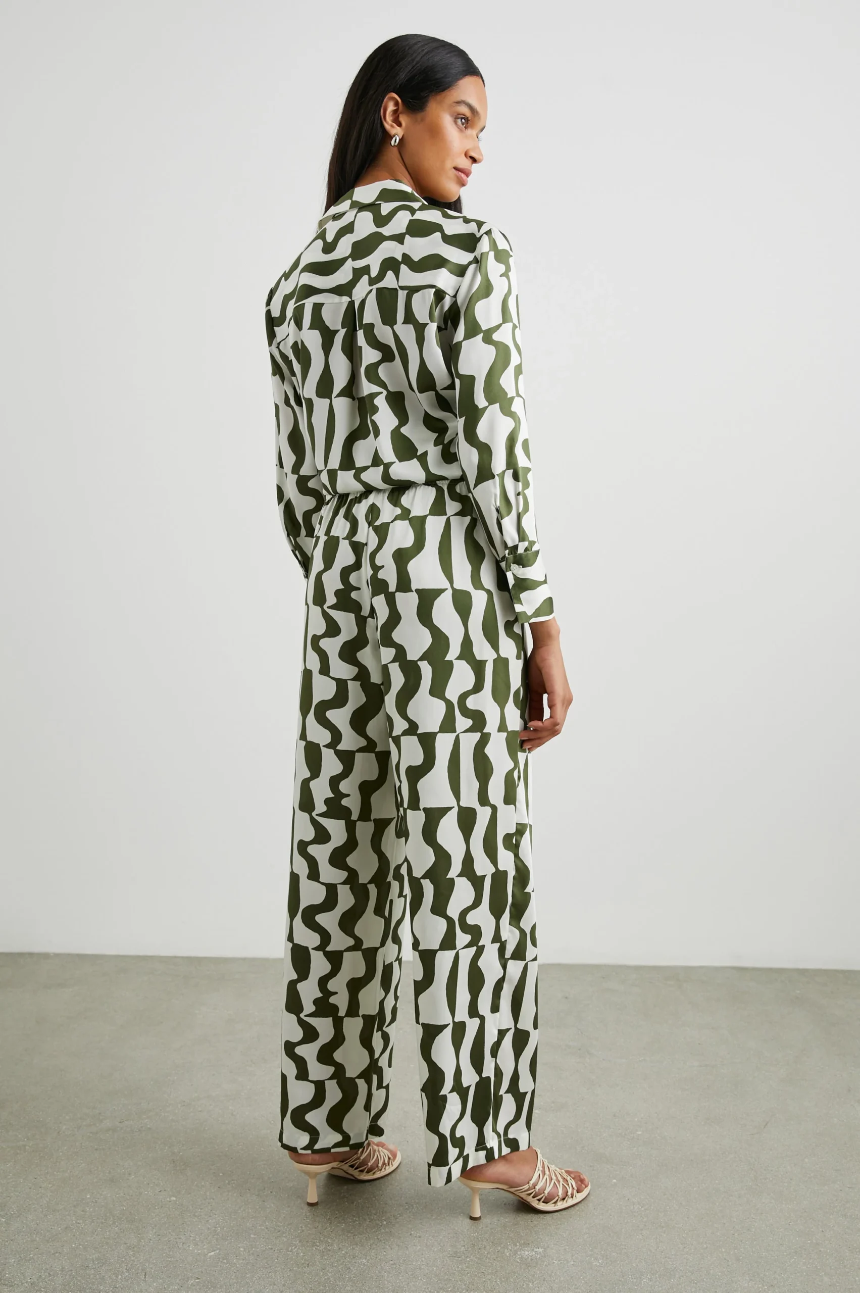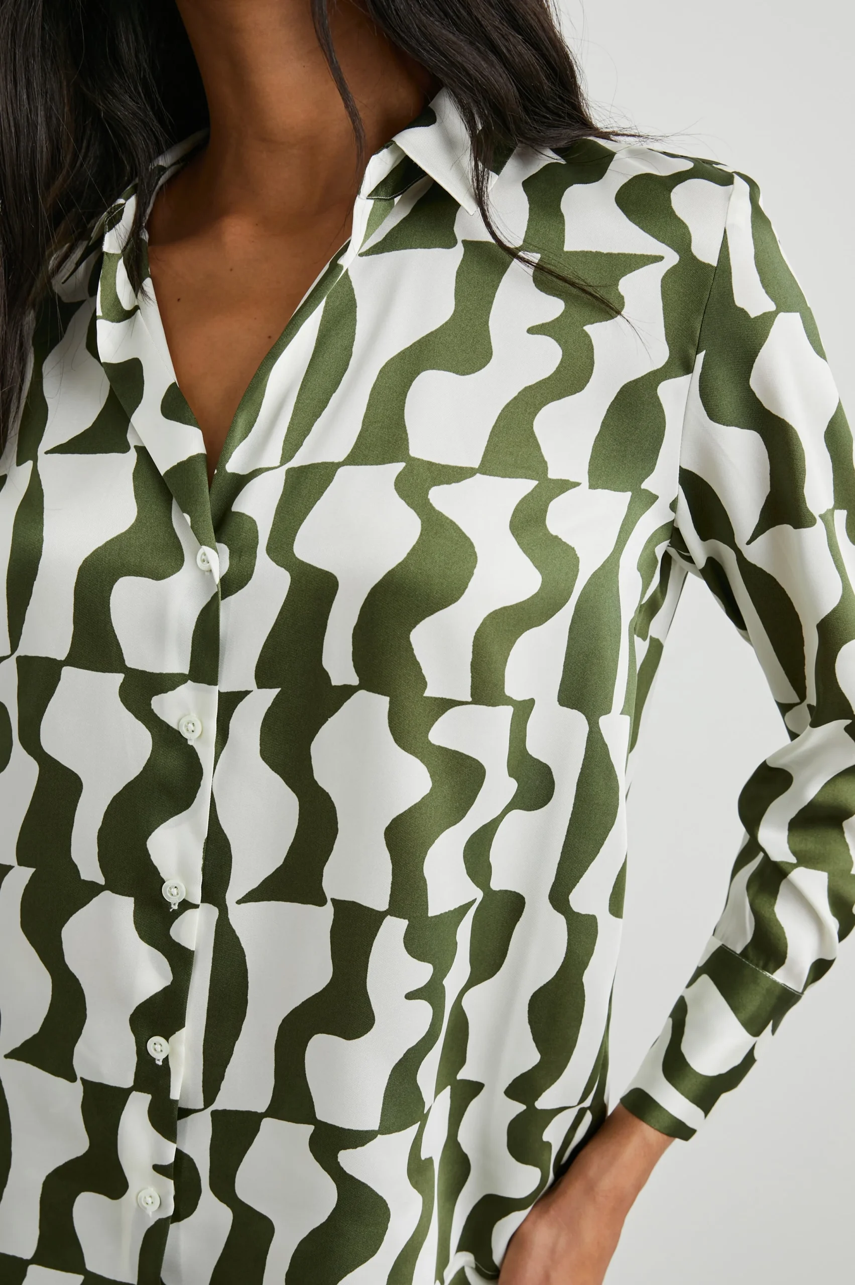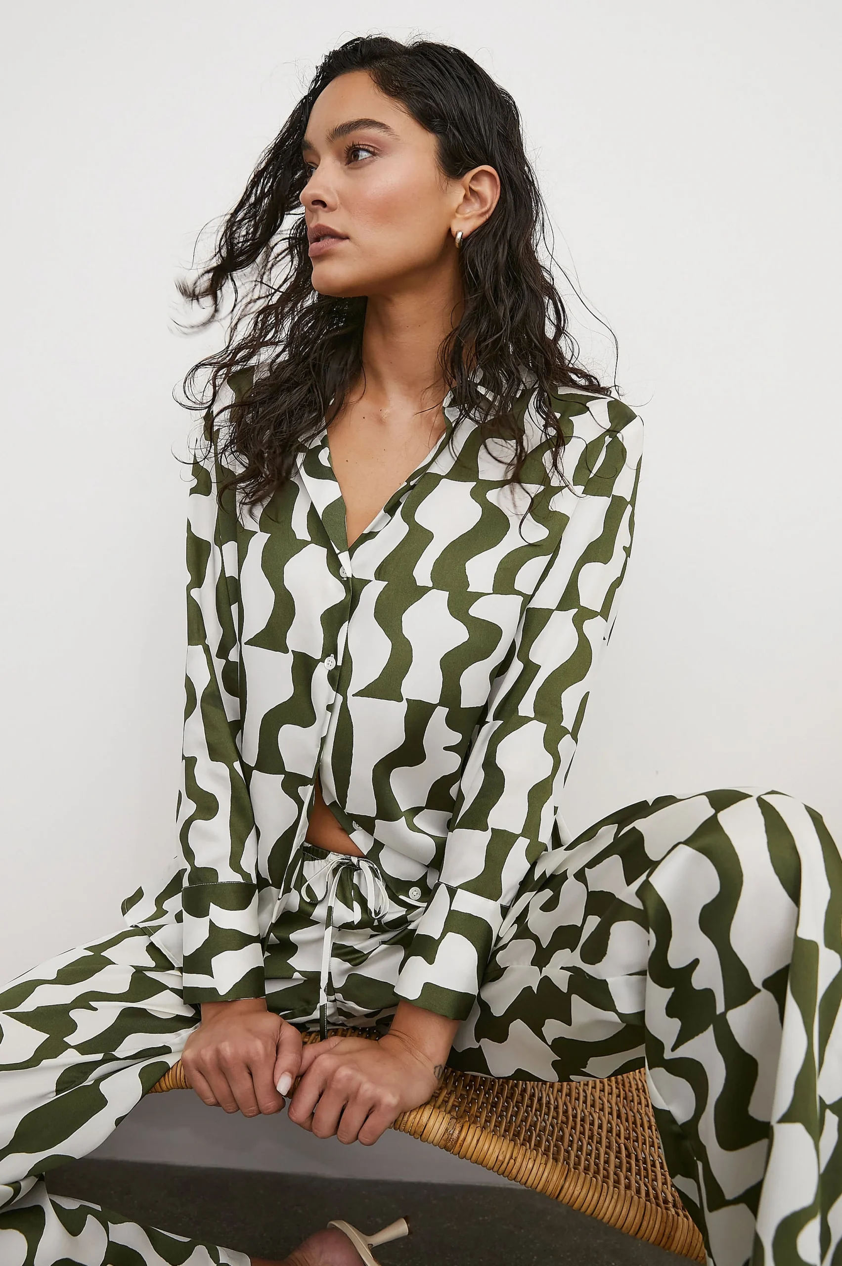 DETAILSCrafted in shiny twill, this soft and sleek buttondown takes any outfit up a notch. Complete with an open neckline, relaxed body, and funky retro print.100% Viscose.Imported. CAREDry clean only. FITRecommend ordering true to size.Front Body Length: 27 1/4″