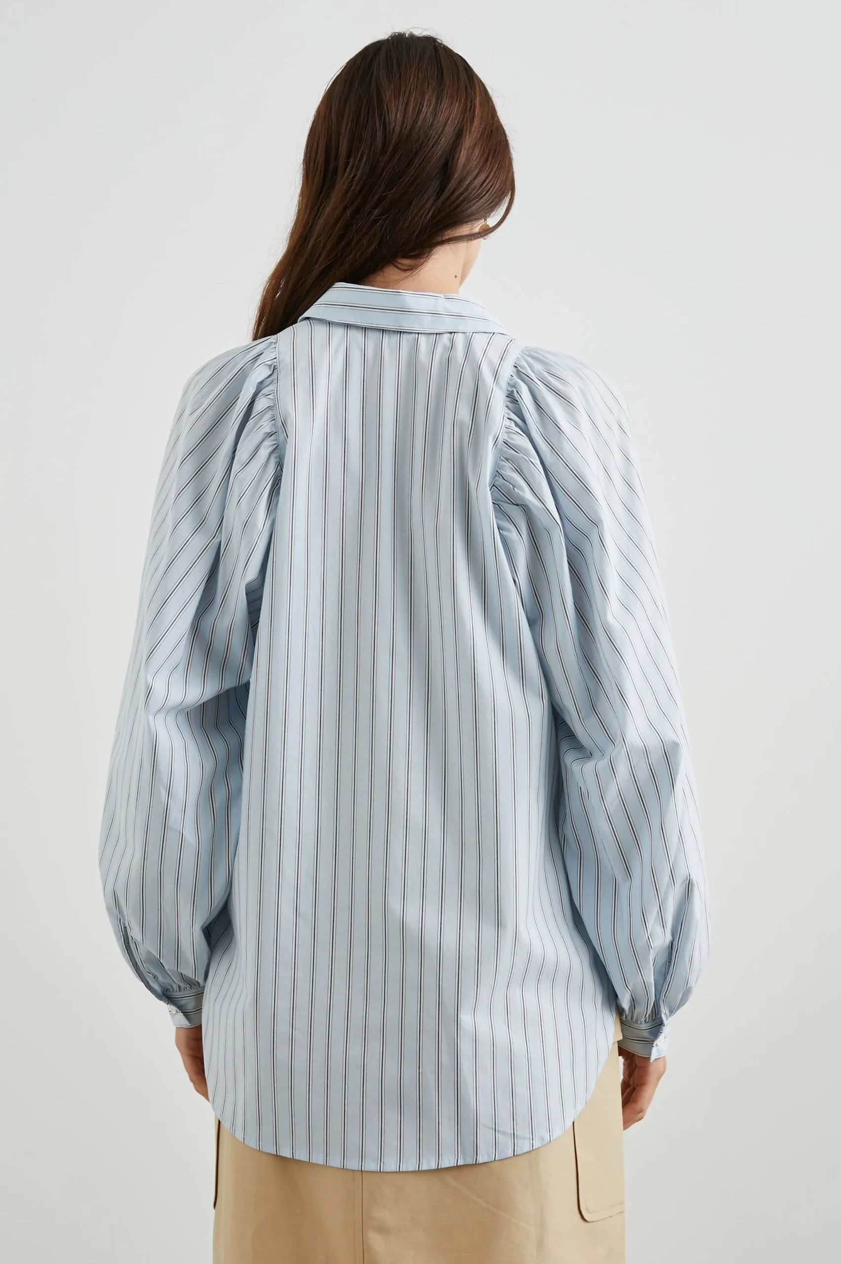 Stripes are all the hype this season, making the Livy shirt a must-have. This style features dramatic billowy sleeves and a classic collar and buttons. It pairs perfectly with trousers for work and shorts for weekends.