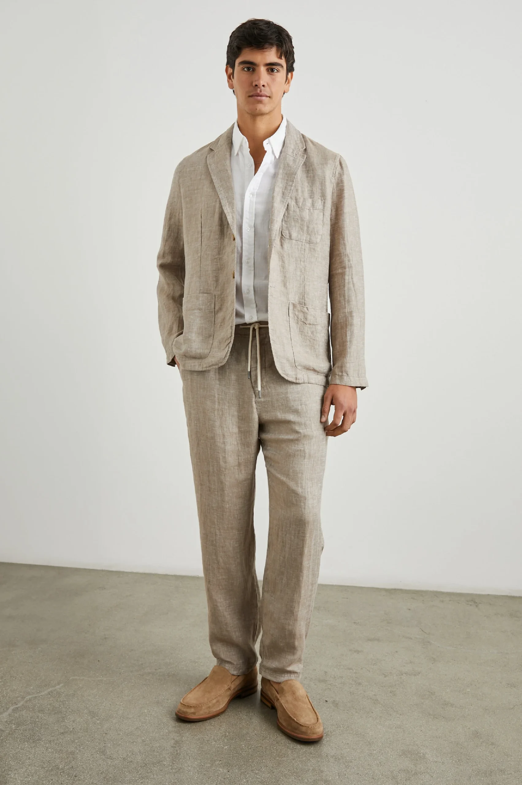 The Mercer Pant is a go-to, tailored style made of lightweight, super soft linen twill fabric. Cut for a slim fit that tapers from the knee down, it features a button fly, pockets, and an exterior drawcord for when the waistband needs tightening.