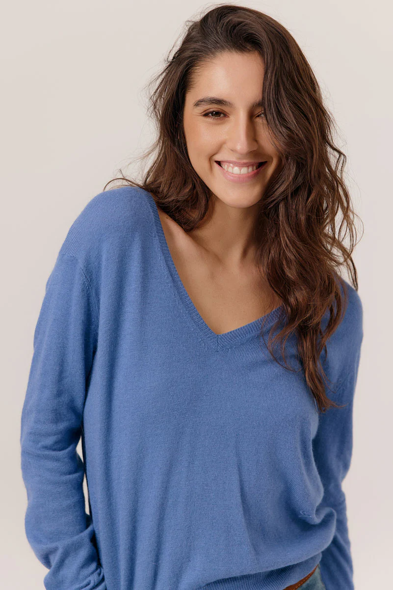 Sa maille est fine, douce, légèrement angora, agréable dès qu’on l’enfile. Cette saison, Eden s’habille d’un bleu doux, presque indigo, qui agit comme un filtre bonne mine immédiat. Sans retouche. Sans prise de tête. Il éclaire le teint et remet un peu d’ordre dans la journée.