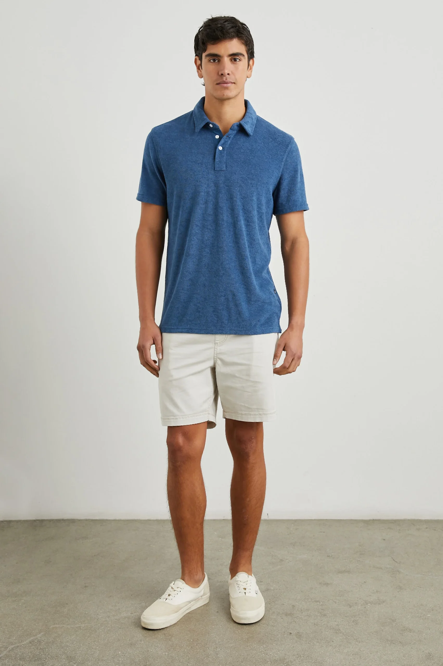 The Rhen Polo Shirt presents a Southern California vintage aesthetic while leaning into contemporary style. Designed with a two-button placket, this dark blue polo is made from a towel terry, viscose blend that gives it a pleasingly soft feel.