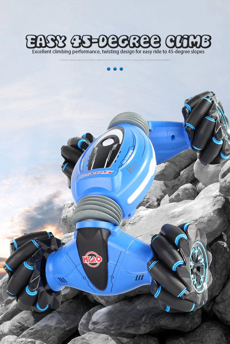 Conversion en un clic – convient pour courir sur n’importe quel terrain. Il suffit de cliquer sur le bouton de la télécommande, son corps se pliera, les quatre roues seront plus serrées et le sol sera stable. La voiture passera d’une forme plate à un véhicule tout-terrain.