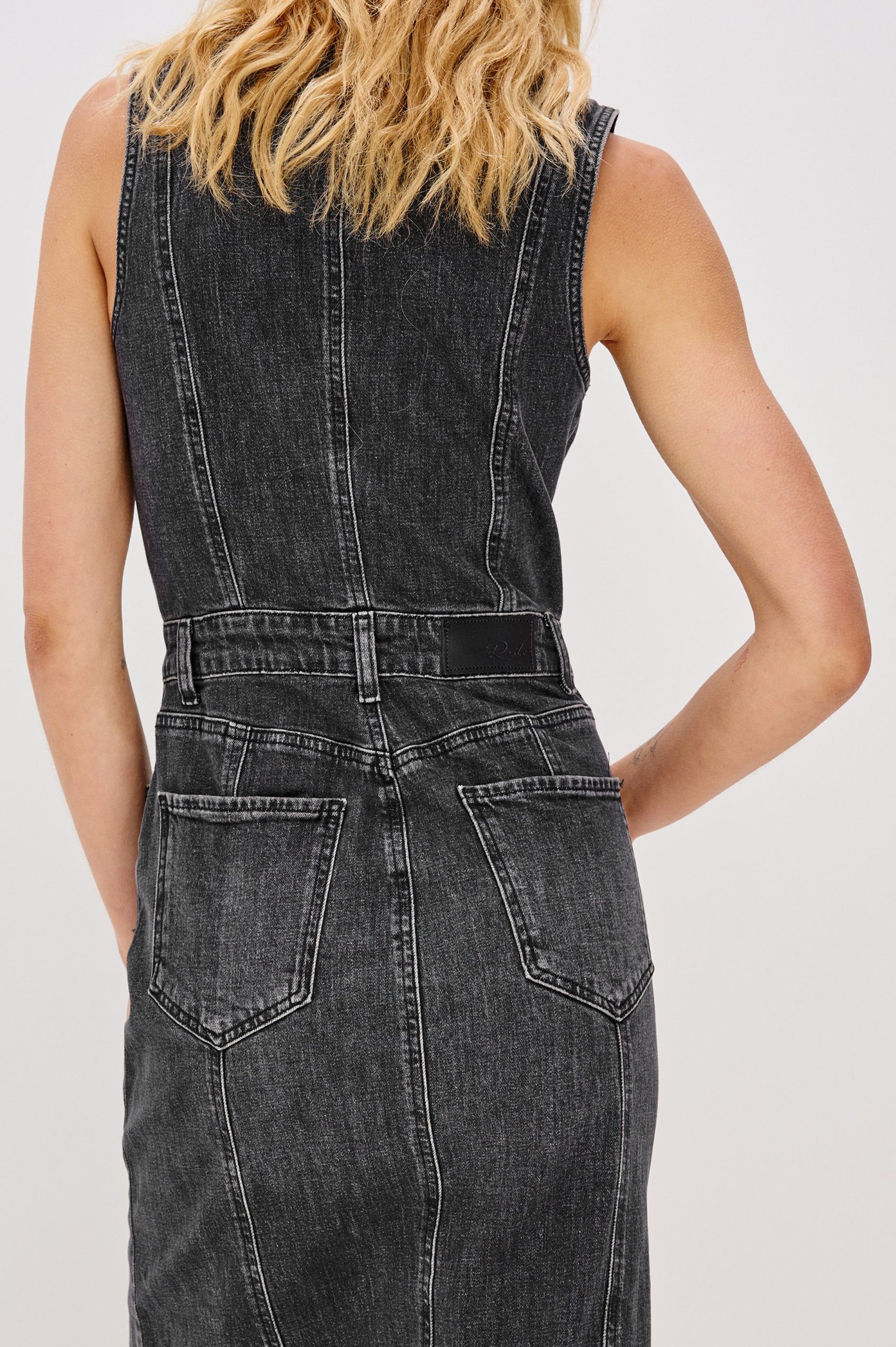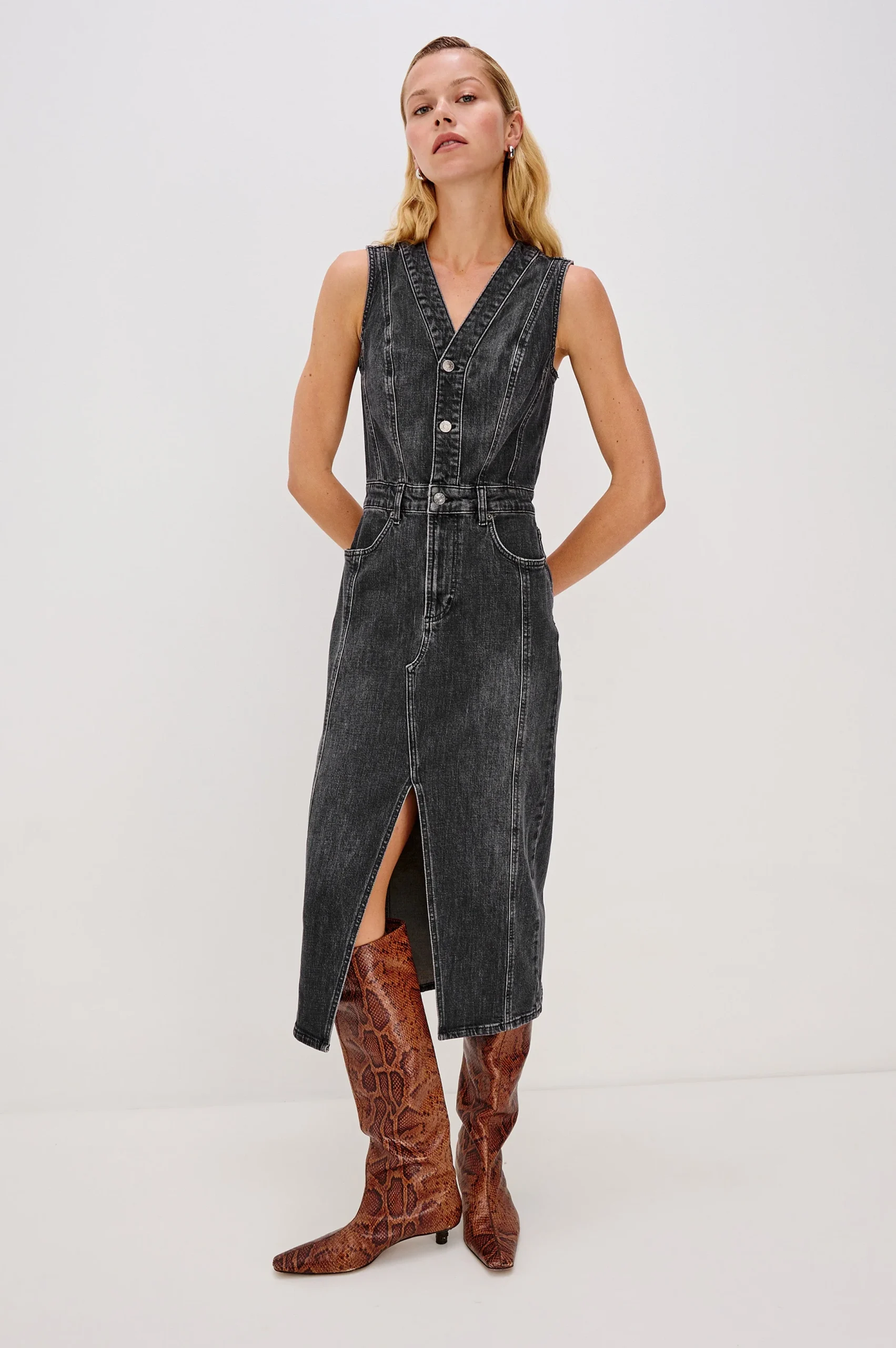Skirt meets classic pinafore in the retro-inspired Westwood, a form-fitting denim dress finished with a hybrid zip, button-front closure and front slit for ease.