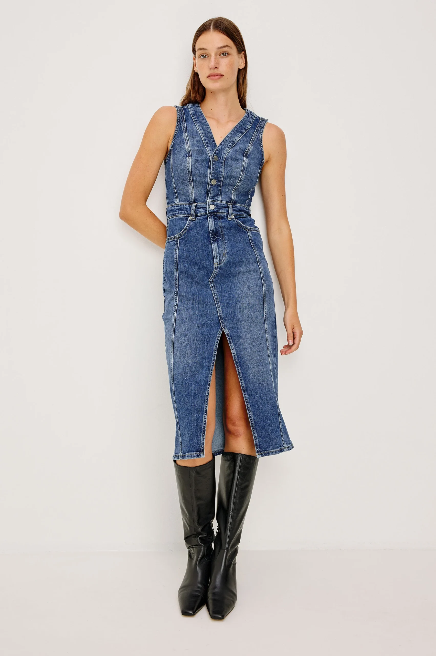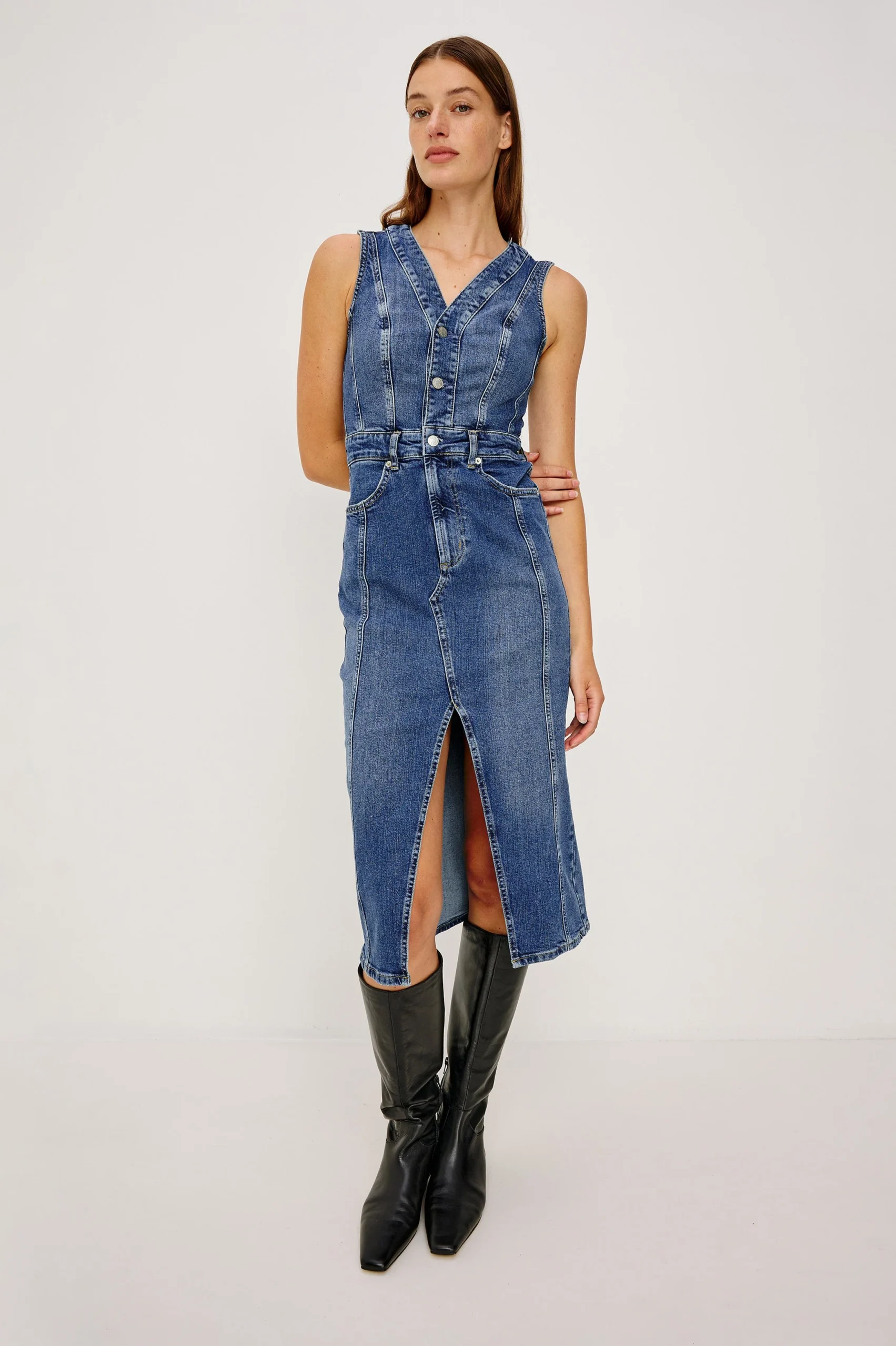 Skirt meets classic pinafore in the retro-inspired Westwood, a form-fitting denim dress finished with a hybrid zip, button-front closure and front slit for ease.