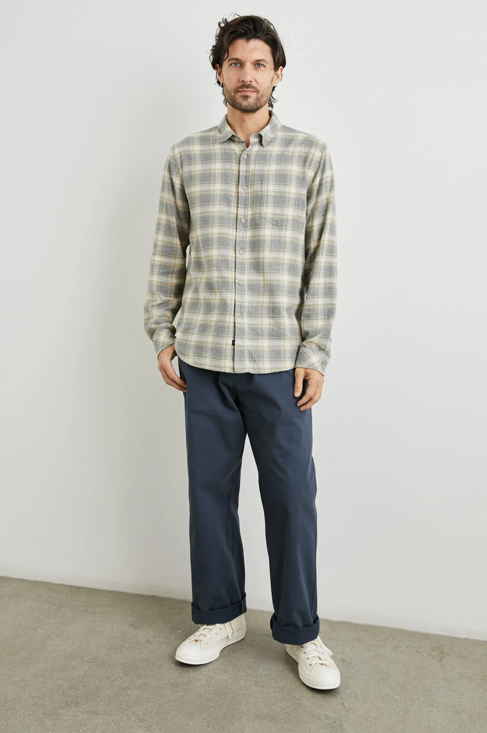 Super soft, breathable cotton fabric mixed with a relaxed body shape makes the Wyatt the perfect Southern California inspired button-down. A classic shirt featuring a single patch pocket at chest.