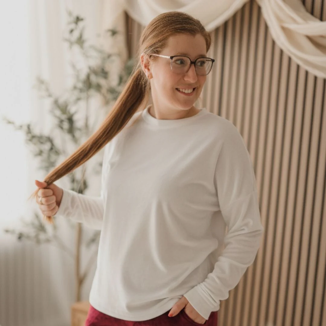 Chandail détente à manche longue blanc cassé pour femme, idéal aussi pour la maternité