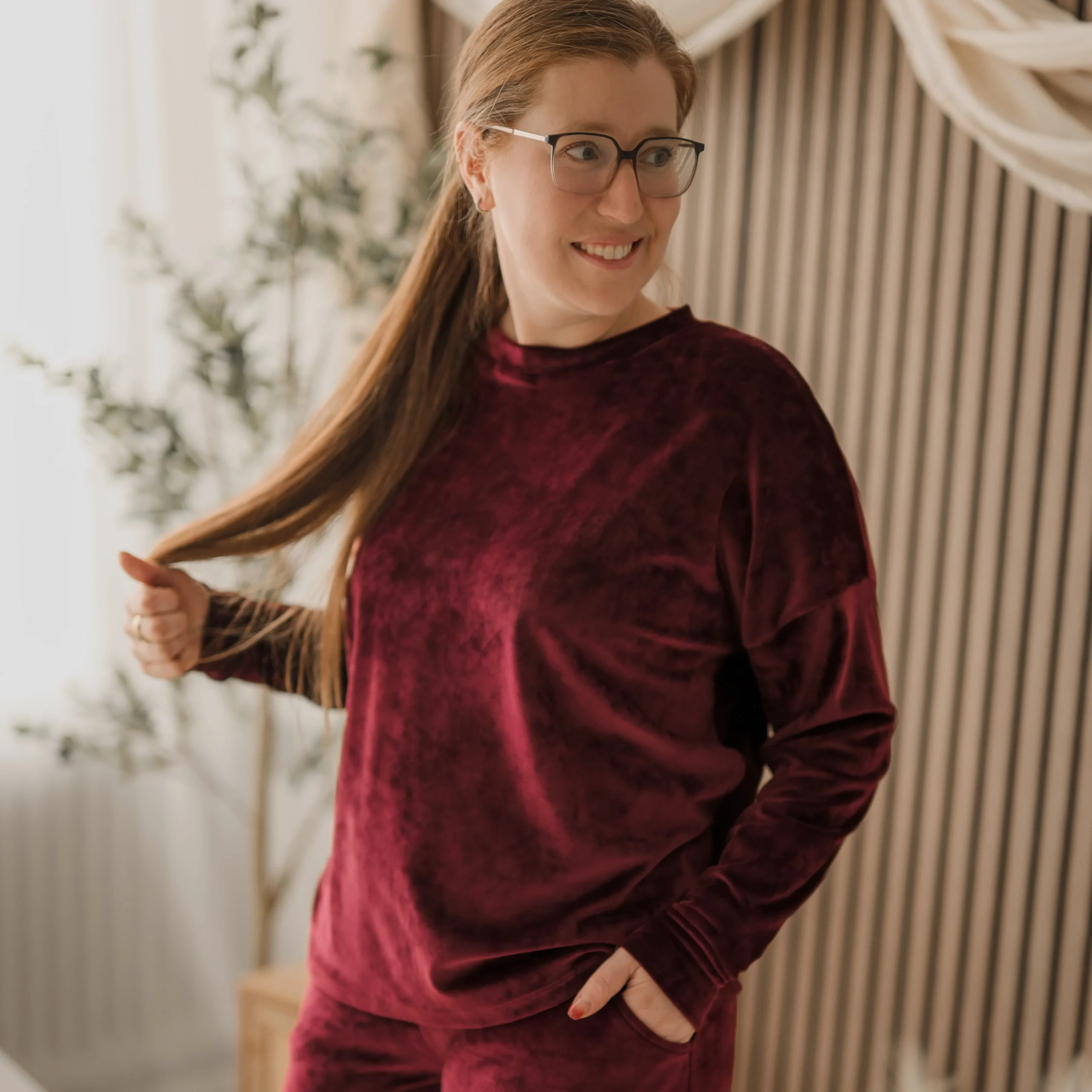 Chandail détente à manche longue rouge vin pour femme, idéal aussi pour la maternité